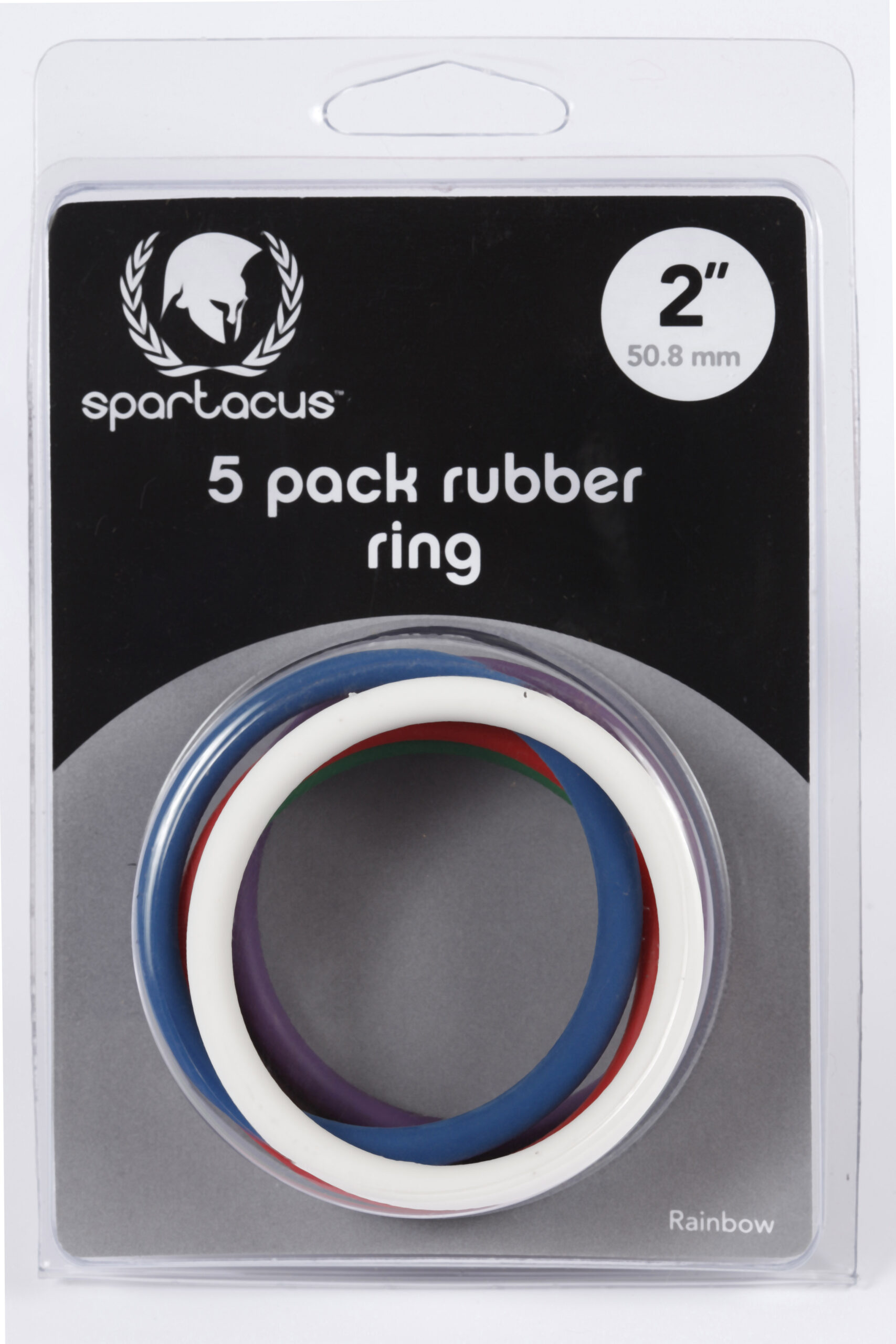 Spartacus Leathers Cock Gear Rubber Cock Rings Rainbow Rubber 5 Pack includes blue, green, purple, red and white cock rings in a single size. 2 inches Soft Rubber Cock Rings Rainbow accessorize any outfit with this set of cock rings. What fun! When worn a