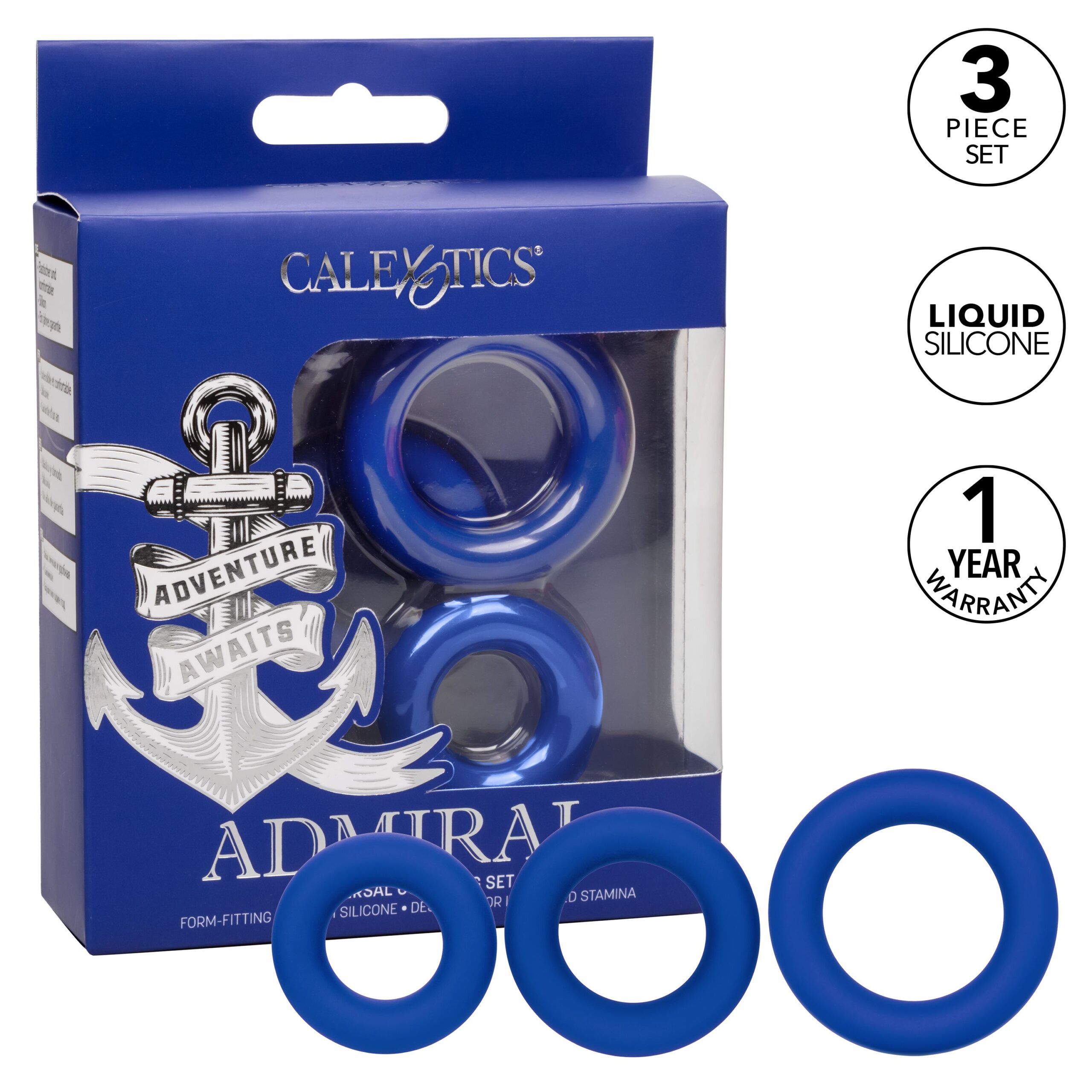 Admiral Universal Cock Ring Set from California Exotic Novelties. Uncharted territories of pleasure await you with the adventurous Admiral Universal Cock Ring Set. A set of 3 gradually sized liquid Silicone enhancers wrap you up in a thrilling embrace to