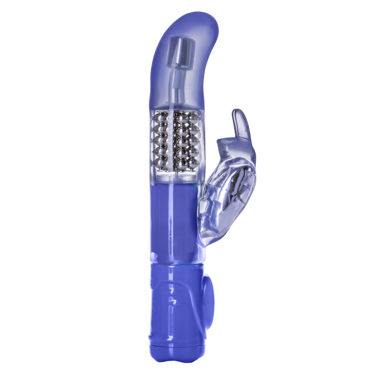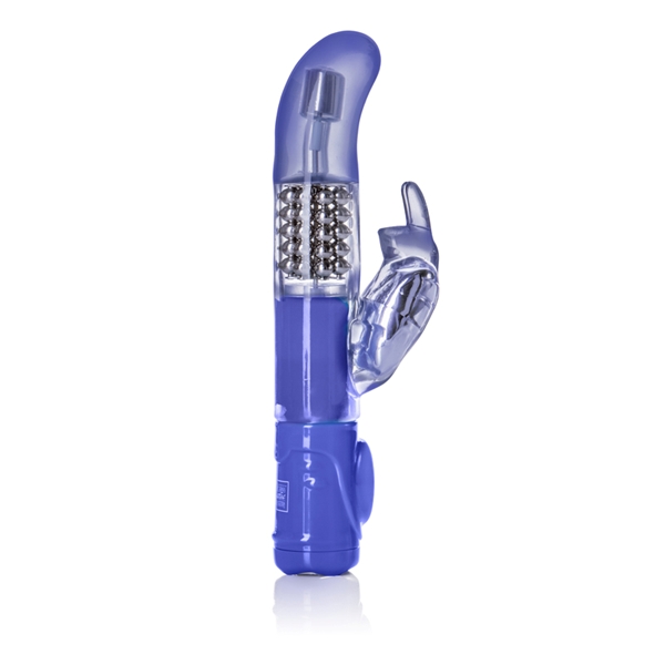 Advanced G Jack Rabbit Purple Vibrator from California Exotic Novelties. The sleek and ultra smooth Advanced G Jack Rabbit vibe is the perfect combo stimulator for intimate erotic pleasure. The curvy, massager boasts a G-Curve for intense G-Spot stimulation and heightened orgasmic sensations. The exotic Rabbit Vibrator is made from smooth and soft Thermoplastic Elastomers TPE and has a pliable, flexible shaft with synchronized rotating beads and reversible rotation action, a soft curved G-Spot tip and a contoured bunny shaped clitoral teaser. The easy push button ABS Plastic controller allows you to customize your ecstasy experience as you go. If you need to pause the action, the auto on/off controls let you turn off the power until you are ready to be turned on. For an intensified climax always use a quality water based personal lubricnat. The stimulator is waterproof and ideal for solo or couples play time fun in the hot tub, bath or shower. Use the massager to arouse and tantalize erogenous zones, and all sensitive areas of the body. Before and after use, always clean with a toy cleaner spray. Everything you love about the Jack Rabbit Vibrator now with a G-Curve for intense G-Spot stimulation. Flickering bunny ears with 10 intense functions of vibration, pulsation and escalation. 4 speeds of independent reversible rotation. 5 solid rows of non-jamming, synchronously rotating beads. Easy push button controls with auto off. Sex toy level advanced. Waterproof for play in and out of the water. Safe and pure for body and pleasure made using phthalate free materials Thermoplastic Elastomers TPE Shaft, Rabbit, ABS plastic controller. 5 inches by 1.5 inches Shaft. 2.5 inches by 1.5 inches Rabbit. Jack Rabbit Vibrator requires 3 AA batteries to power up, not included. 1 year warranty. Categories: Vibrators, Rabbit Style Vibrators, Sex Toys for Women, G-Spot Rabbit Style. 2023.
