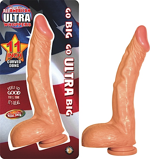 All American Ultra Whopper 11 inches Curved Dildo. Features: Better-than-Realskin. Suction cup base. Harness compatible. Veined texture for that real feel. Waterproof, non-vibrating dildo. Phthalate free material PVC. Size 11.5 inches in length by 6.7
