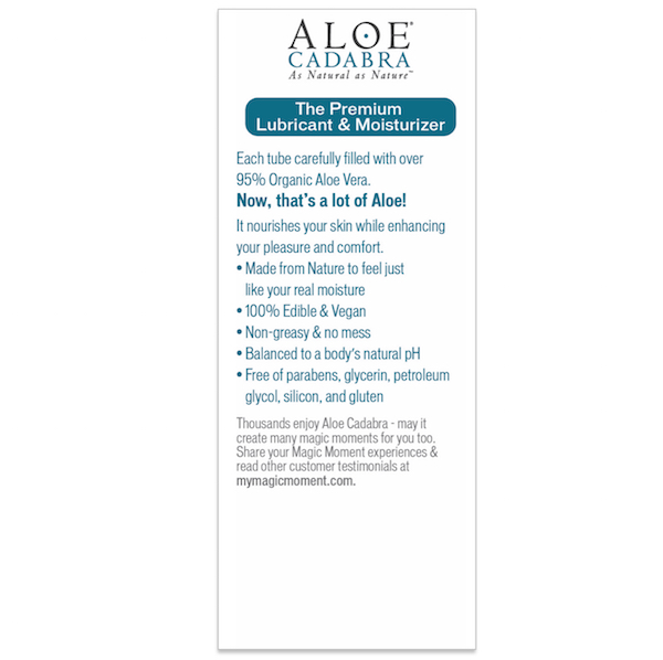 Aloe Cadabra Organic Lubricant Natural Aloe 2.5 fluid ounces. Doctor recommended. FDA cleared. Aloe Cadabra is an all natural personal lubricant made from 95% organic Aloe Vera. Try it for vaginal dryness, sex after menopause and anyone looking for a Natu