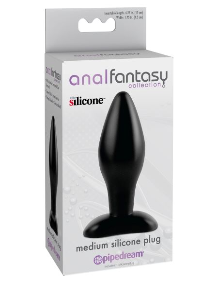 Anal Fantasy Collection Medium Silicone Plug Black from Pipedream Products. At 1.75 inches wide with an insertable length of 4.25 inches, the medium Silicone Plug has a tapered tip for easy entry, a bulb that provides extra sensation, and a narrow neck t
