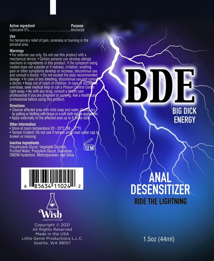Big Dick Energy BDE Anal Desensitizer from Little Genie Productions. Big Dick Energy Anal Desensitizer is specially formulated to increase comfort and sexual pleasure during anal play. Enjoy an enhanced anal experience and Ride the Lightning with BDE Anal
