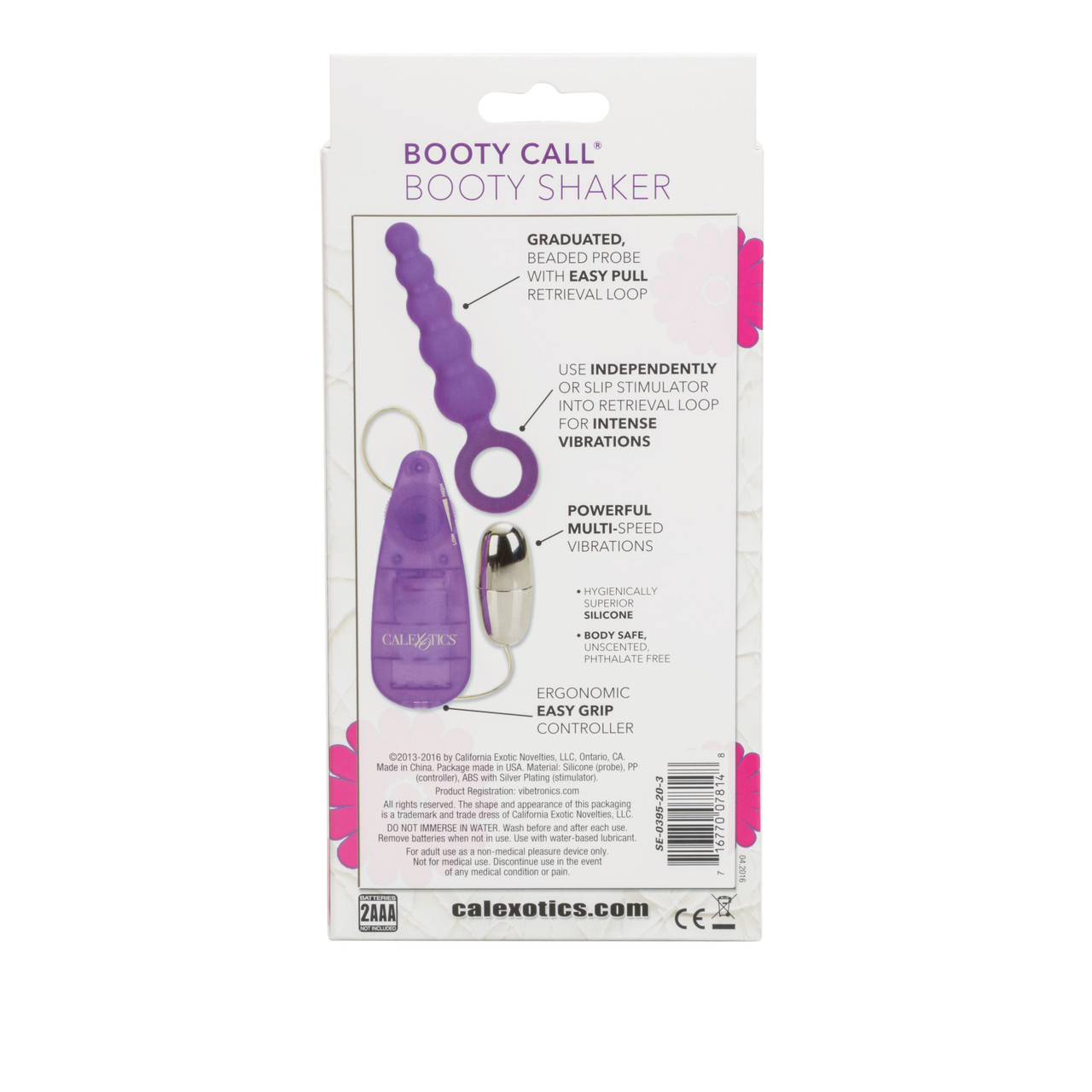 Booty Call Booty Shaker Purple Graduated Probe. The Booty Call Booty Shaker Probe and Stimulator features twice the stimulation for twice the fun. Double up the toe tingling pleasure with this dual purpose, super versatile, multiple speed vibrating massager complete with a Graduated Probe to shake things up in the bedroom. Perfect for using alone or with a partner, this pure and safe Silicone Probe and massager offers versatile pleasure and can be used together for a heightened experience or can be used separately as individual pieces. The Silicone material, which is fully waterproof, makes the knobbed probe a great toy to use in the shower or the bath and because it emulates the shape of beads, it adds further pleasure to the user. The bullet offers multiple speeds and can be used together with the probe by inserting it through the probe’s circular handle; alternatively, the circular ring acts as a fantastic grip for easy retrieval when the vibrating massager is not attached. Which ever way you choose to use the Booty Shaker Probe and Stimulator, it will bring you optimum pleasure. Designed to stimulate your senses the probe will send waves of excitement throughout your body. And because of the probe’s gradual design, you can start small and work your way up for optimal prostate pleasure. Premium Silicone probes with removable stimulator. Powerful multi-speed vibrations. Stimulator and Probe may be used together or separately. Easy to use controller. Safe and pure for body and pleasure. Made using phthalate free materials: Silicone Probe, Polypropylene PP Power Controller, ABS Plastic with Silver Plating Stimulator. Vibrating sex toys 2 AAA batteries, not included. Cal Exotics categories: For Women, For Men, Anal Toys, Anal Toys, Probe, Probes. 1 year warranty. Categories for the Booty Shaker: Anal Toys, Prostate Massager, P-Spot Stimulators, Classic Flexible Vibrators, Small and Medium Butt Plugs, Vibrators, Sex Toys for Women. 2023.