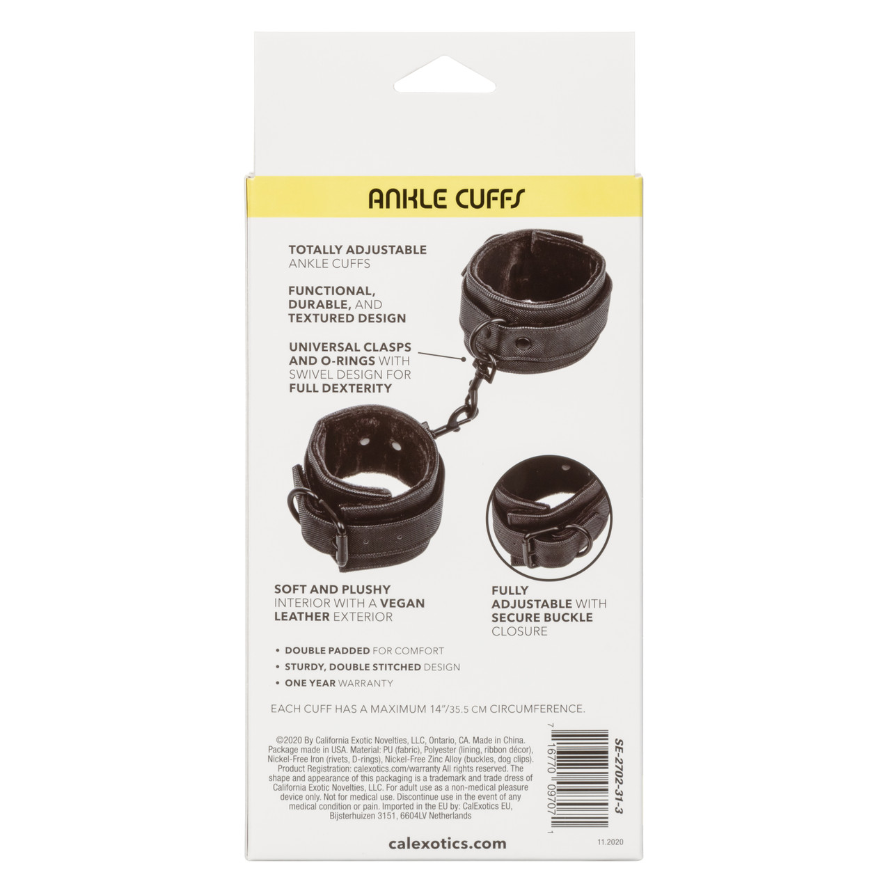 Materials: Polyurethane PU, Polyester, Nickel free Alloy, Iron. Features Phthalate free. 90 days warranty. Measurements 14 inches maximum circumference, diameter. Bulk weight 6.5 ounces. Package 7.9 ounces. Package 2 inches by 4 inches by 8.5 inches. 1 year warranty. Categories: Bondage, Fetish, Kink, Bondage Restraints, Cuffs, Sex Toys for Couples. 2023.