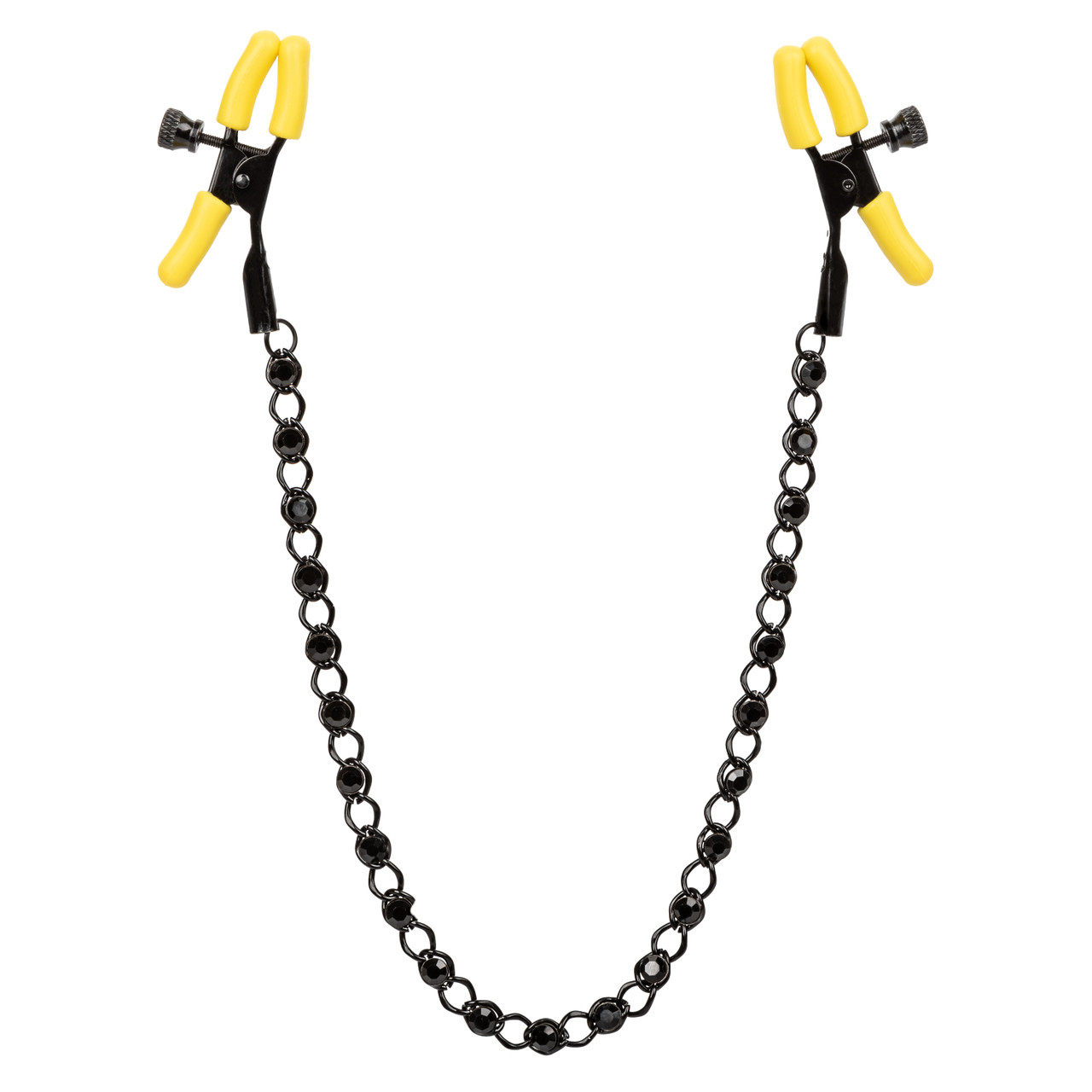 Boundless Nipple Teasers from California Exotic Novelties. Push yourself towards endless pleasure and embrace the teasing stimulation of the Boundless Nipple Teasers. Explore elevated sensation with the 2 fully adjustable nipple clamps, sensual chain and sparkling crystals. Reach new levels of playful pleasure with the adjustable clamps. Clamp the naughty clasps to your body and enjoy every rush of pain and pleasure. The clamp has adjustable tension to stimulate anywhere on your body for playful teasing. As the tension tightens, the tingles intensify with every turn of the dial for the ultimate in nipple stimulation toys. With the teasing clamps, you can look forward to amplifying nipple sensitivity and intensifying overall arousal. These easy to use nipple teasers are great for everyone. The two adjustable clamps are made from body safe materials and feature soft, comfortable Silicone pads. Specifications Boundless Nipple Teasers: Collection Boundless. SKU SE-2702-01-2. UPC 716770104311. Recommended Pleasure Enhancers from CalExotics. Color Black. 1 year warranty. Material type Hard. Features: Phthalate free. Measurements: 2.25 inches by 5.75 inches Nipple Clamp. Bulk weight 1.1 ounces. Package 2.1 ounces. Package: 0.70 by 3.5 inches by 7.1 inches. Categories: Bondage, Fetish, Kink, Nipple Play, Sex Toys for Women, Bondage Kits, Kinky Sets. 2023.