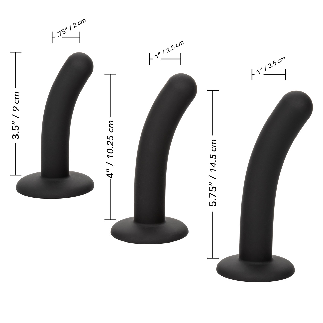 Boundless Silicone Curved Pegging Kit from California Exotic Novelties. Introducing the Boundless Silicone Curve Pegging Kit, a complete package designed for unforgettable pegging experiences. This kit includes a universal harness with fully adjustable waist and thigh straps, ensuring a secure and comfortable fit that can be tailored to your body shape. The harness features a supportive and form fitting design, providing stability and control during play. Its discreet snap design allows for easy swapping of the three included curved Silicone probes. These probes come in different sizes, allowing you to customize your experience and explore various levels of pleasure. Crafted from high quality Silicone, the probes offer a velvety smooth texture. The curved design targets sensitive areas, delivering precise stimulation and intensified sensations. Whether you are a beginner or an experienced user, the Boundless Silicone Curve Pegging Kit caters to your desires. Embrace the versatility and freedom this kit offers, as you indulge in thrilling pegging adventures. Specifications: SKU SE-2700-80-3. Color Black. 1 Year Warranty. Features: Wearable, Suction Cup, Phthalate free, Adjustable. Waterproof. Material type: Polyurethane PU Harness, Polyethylene PE Lining, ABS Plastic Buckles, Polyester Straps, Nickel free Alloy Metal Snaps, Silicone Probes, Ring. Measurements: 3.5 inches by .75 inch Small Probe. 4 inches by 1 inch Medium Probe. 5.75 inches by 1 inch Large Probe. Fully adjustable harness fits up to 61 inches. Bulk weight 10.2 ounces. Package 11.4 ounces. Package: 3 inches by 4 inches by 8.5 inches. 1 year warranty. Categories: Prostate Massagers, P-Spot Stimulators, Probes, Sticks and Rods, Sex Toys for Couples, Strap-Ons, Harnesses, Dildos, Dongs, Sensual Kits. 2024.