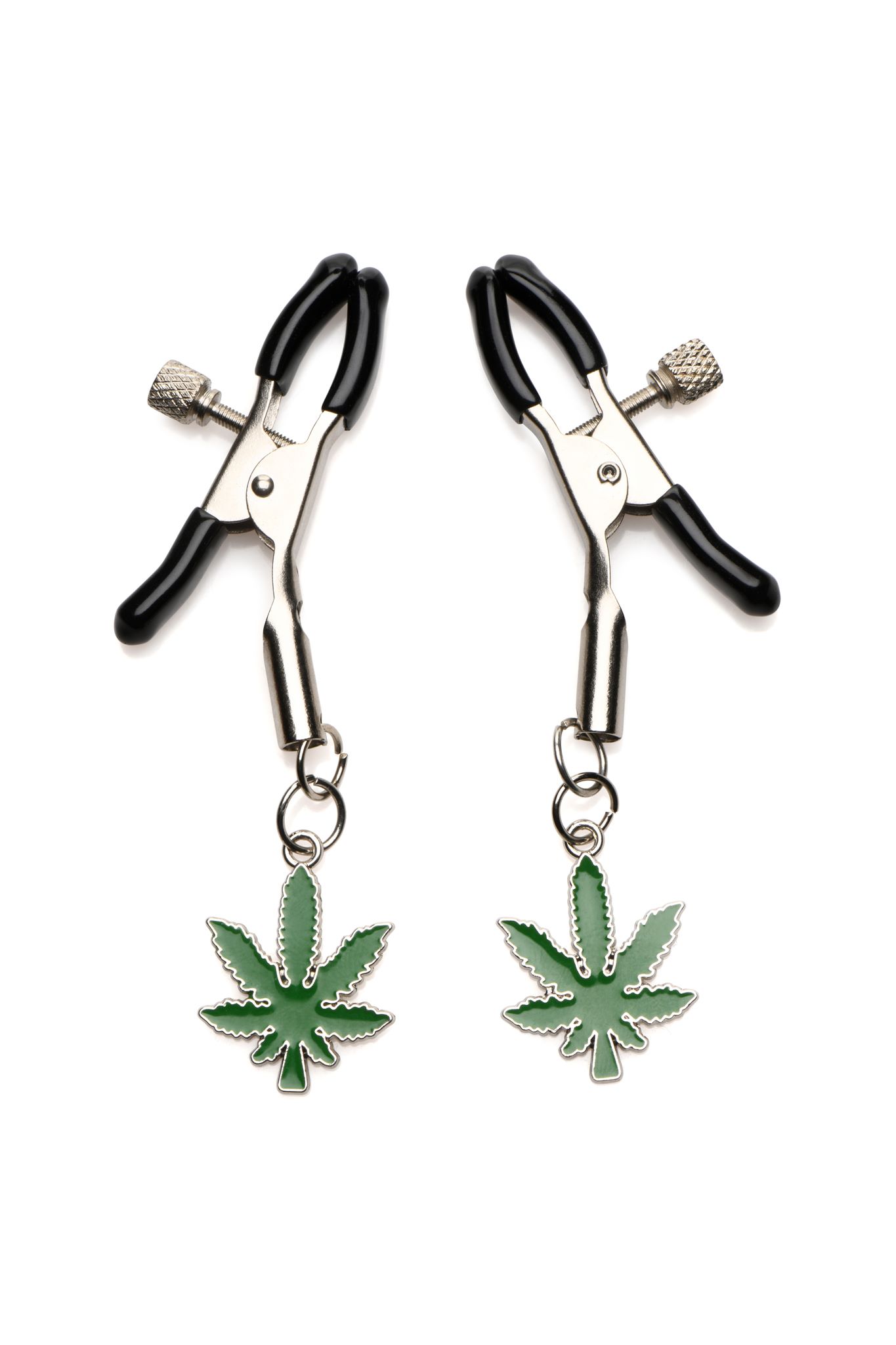 Charmed Mary Jane Nipple Clamps from XR Brands. Add these Mary Jane themed nipple clamps to your ensemble and accessorize according to your favorite plant! With these delicate, nickel free, metal ornaments, the leaf dangles at the end of each clamp. The clamp itself is made of nickel free metal as well for sensitive skin. To protect the nipples, the tips are covered in vinyl. These are perfect for using with newbies and experienced users alike! The adjustable turn-screws allow you to choose exactly which pressure you want! After use, simply rinse with water and mild soap, then spray with a toy cleaner. Take one clamp in one hand and grab the nipple in the other hand. Place the clamp right below the nipple along the areola. As you clamp down, adjust using the screw and move slowly. Apply pressure very slowly and release slowly. Every little movement will cause some amount of sensation or pain, so be intentional. Keep it on for no longer than 30 minutes the first few times. As you remove them, keep in mind that removal can be twice as intense as application! Enjoy! Measurements: overall length: 3.5 inches. Nipple Clamps open up to 0.5 inch wide. Materials: Metal, Vinyl, Enamel. Color: Green, Silver. Key features: Mary Jane Themed Clamps: for those who love to light up, these are perfect accessories to your play! Adjustable Nipple Clamps: use the turn screw to adjust for exact pressure. Vinyl covered tips: protect delicate skin with the Vinyl covers. Nickel free Metal. All metal used in nickel free. Categories: Bondage, Fetish, Kink, Nipple Play, Sex Toys for Women, Bondage Kits, Kinky Sets. 2023.
