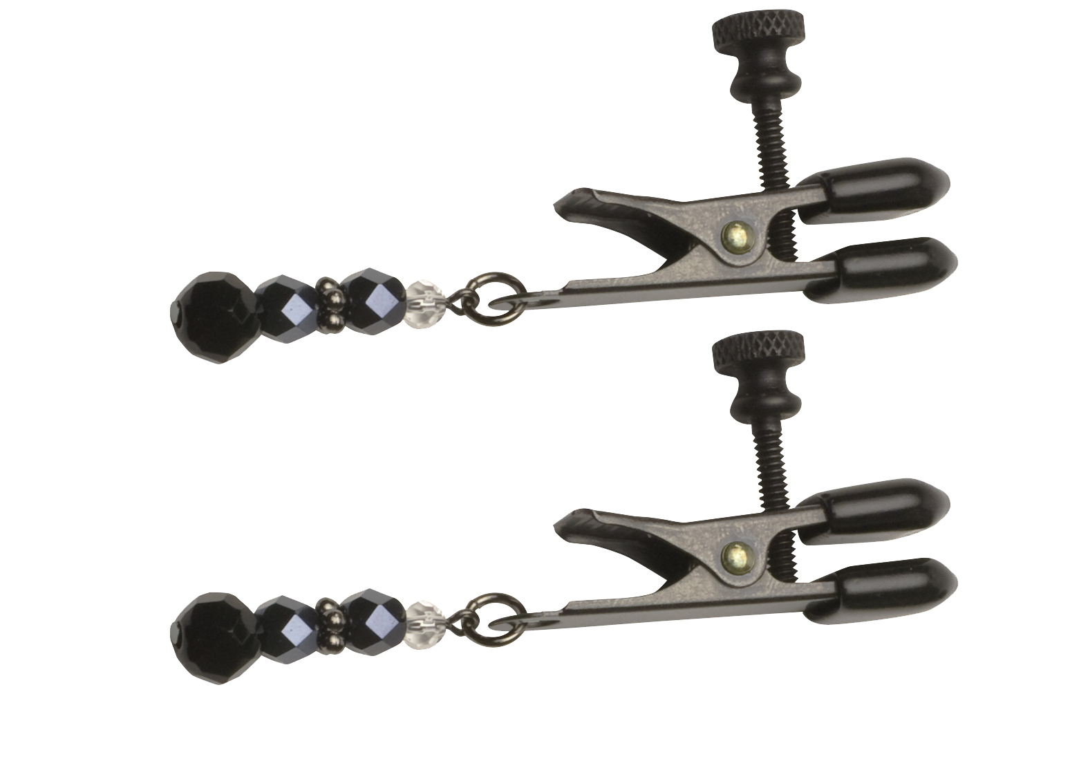Adjustable Beaded Nipple Clamps with Broad Tip and Black Beads . Soft rubber tips. Adjust the clamps by twisting the thumb screw from merely lovely decoration to pretty strong stimulation. Adjustable wide alligator style beaded nipple clamps with pink beads. The broad tip offers moderate to heavy pressures. Soft rubber tips add to comfort. Adjust the clamps by twisting the thumb screw from merely lovely decoration to pretty strong stimulation. Sold as a pair. Spartacus A Passion for Quality Catalog. Spartacus A Passion for Quality Catalog.