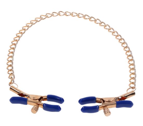 These exquisite clamps feature a gold chain and striking blue plastic tips, blending elegance with a touch of wild playfulness. Perfect for those new to BDSM or seasoned enthusiasts, the adjustable thumb-screws allow you to control the pressure, ensuring a tailored experience. The shimmering gold chain not only adds a sophisticated touch but also offers a tempting opportunity for gentle tugs as passion intensifies. Let your imagination run wild and explore the tantalizing sensations these versatile clamps can bring to various parts of your body.
