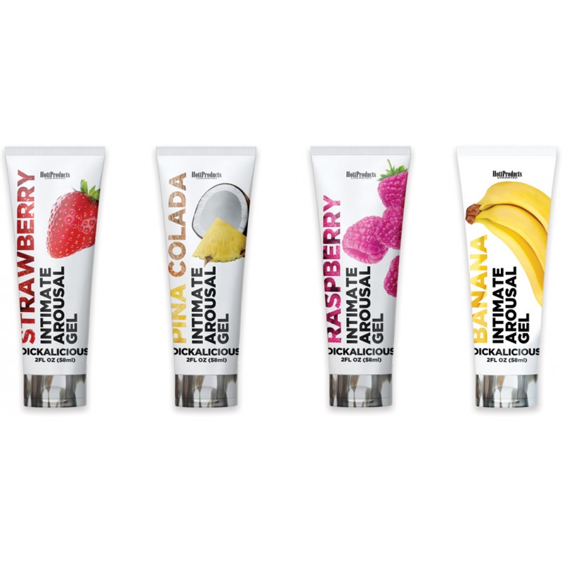 Dickalicious Penis Arousal Gel Point of Purchase Display with 24 pieces. Spread it on, and watch your lover glow for excitement. 4 Dickalicious fun flavors: Banana, Strawberry, Raspberry and Pina Colada. Six of each flavor. Gel is sure to ignite a fire in