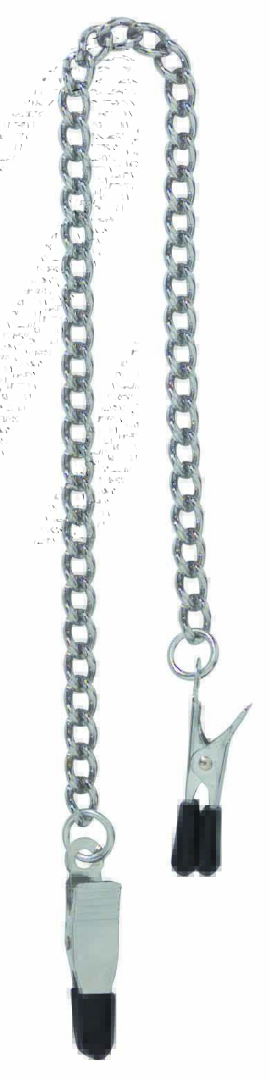 Endurance Nipple Clamps with Link Chain. Focus pain and pleasure when you try out this simple but erotically effective nipple clamp chain combo. Made of two strong rubber-tipped endurance style clamps, the central chain is lightweight enough for extended wear, but with just the right amount of heft for arousal. Endurance clamps have a tight hold and are best suited to experienced nipple clamp enthusiasts. The perfect way to enhance BDSM and kink play, the clamps remain taut with a central spring design, and are not adjustable. Color: Black, Silver Type: Nipple Clamps Material: Metal Type: Endurance Special Features: Connecting Chain. Spartacus A Passion for Quality Catalog page 11.