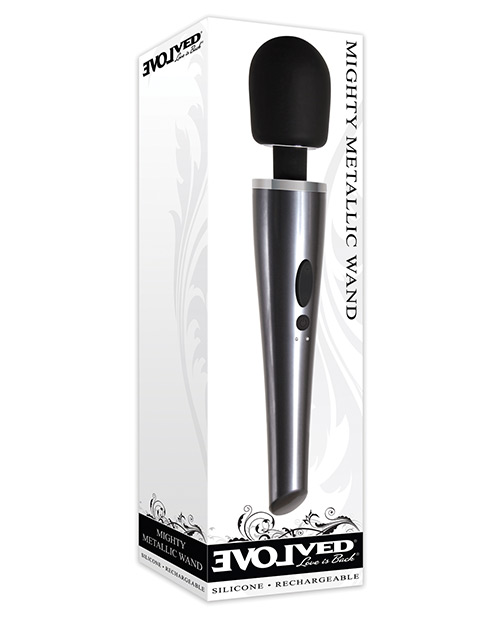 Mighty Metallic Wand Body Massager from Evolved Novelties. This sexy black metallic wand is wireless and rechargeable with 8 powerful speeds and functions that will drive you over the edge in style! The easy to use toggle button is so intuitive that you a
