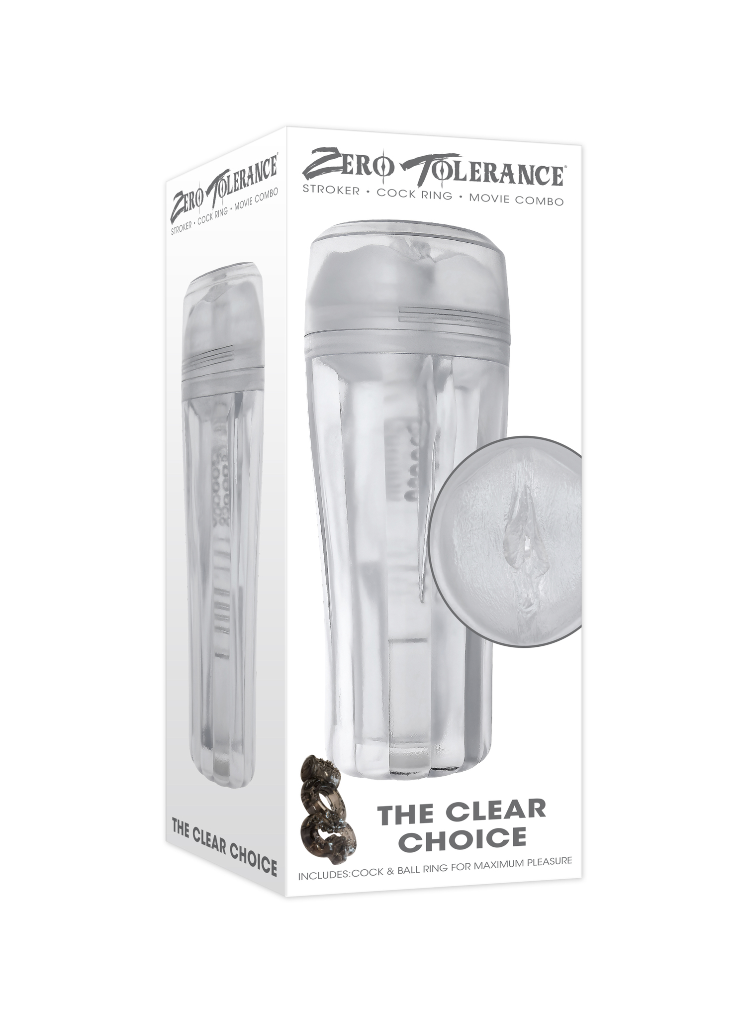 Evolved The Clear Choice Stroker includes, Cock Ring, Movie Combo for maximum pleasure from Zero Tolerance Toys. The choice is crystal clear! This robust stroker is soft and sexy on the inside and durable and textured on the outside for a no slip ergonom