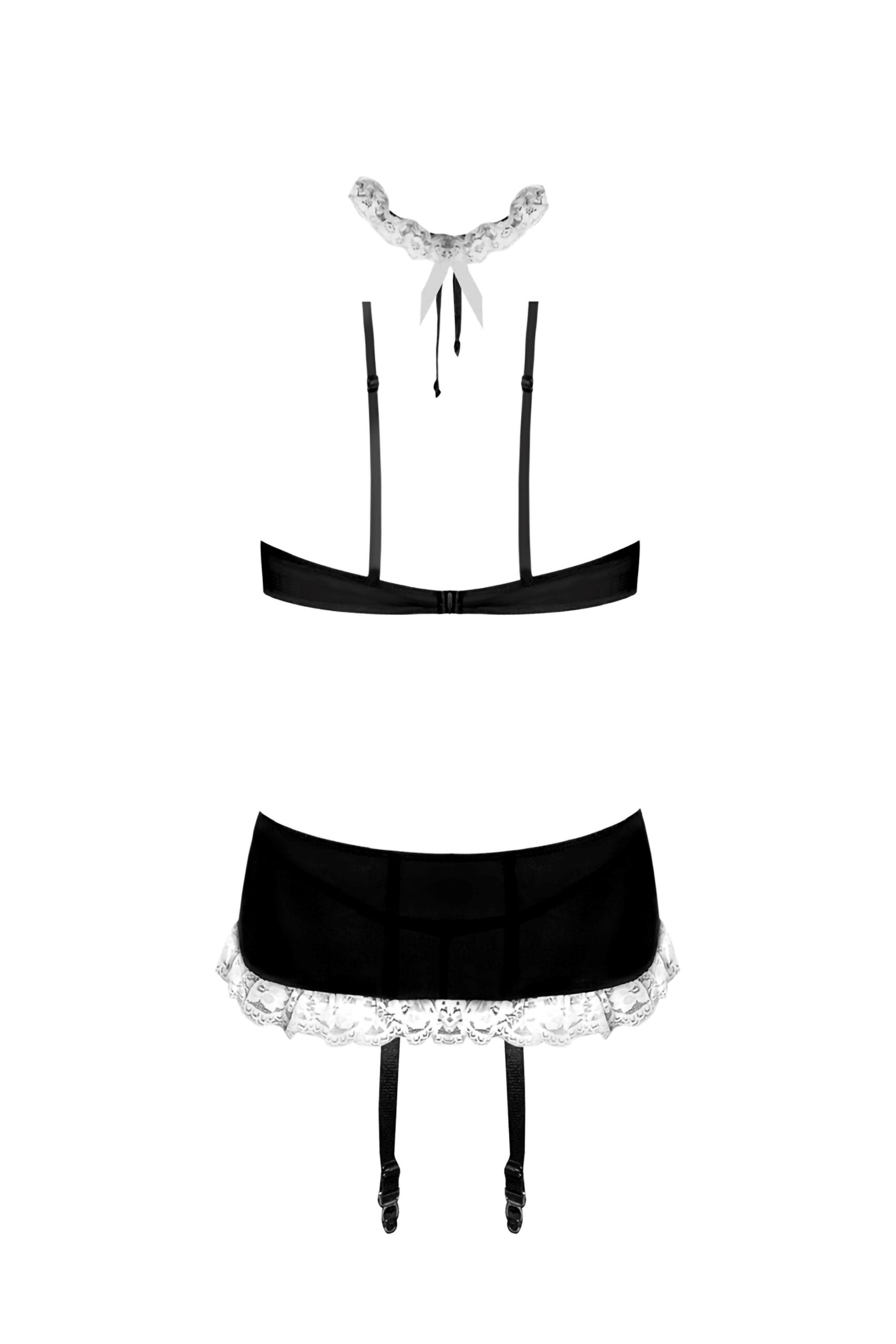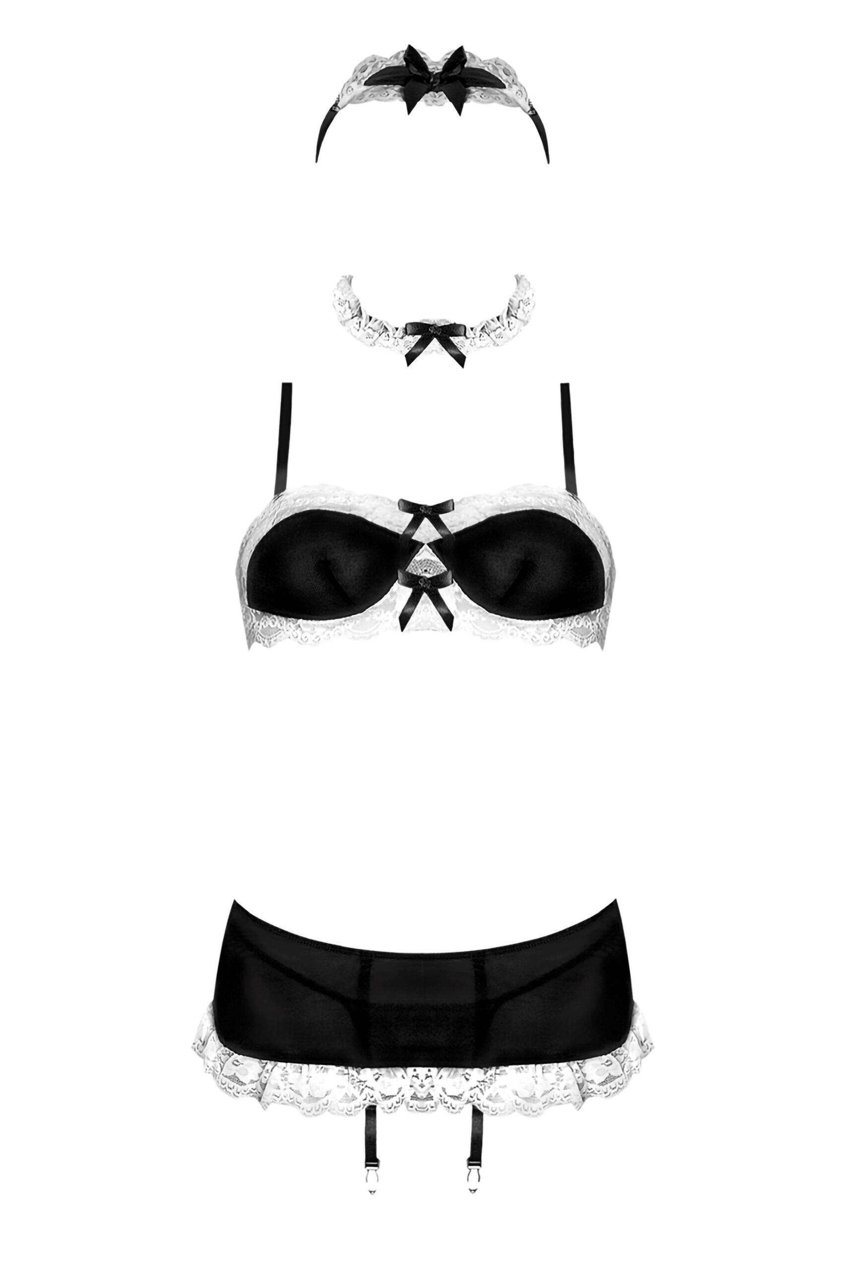 French Maid Black Large Dress Up Costume from the Magic Silk Lingerie Collection this style includes: Bra top clips in back and is trimmed with lace and bows. Skirt featured attached garters and lace hem. Matching choker ties in back of neck and is trim