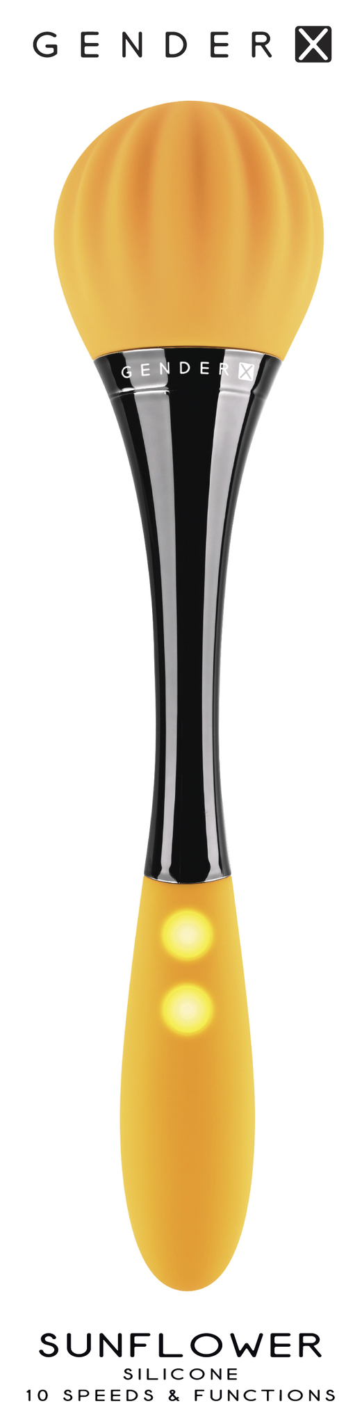 Gender X Sunflower Double Vibrator from Evolved Novelties. Two powerful motors in one stylish double ended vibe! Treat yourself to this two faced robust machine with a textured round wand head on one end and a long, thin oval head on the other. Let the ba