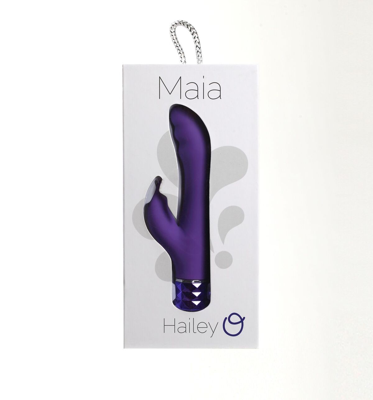 Rechargeable Silicone Rabbit Vibe Hailey Neon Purple from Maia Toys. Hailey is here for you, when extended pleasure and power matter most. Featuring over ten speed settings on two ultra powerful motors, Hailey is always just the way you like her. Constru