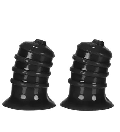 Elong Nipples suckers work…and look so cool. They will suck any size nip and are deep enough and big enough to fit small to medium piercings. These stay on – the base flares out for more contact with skin. What gives them powerful suction are the four springy rings that make the nipple-tube pull open without collapsing like other suckers.
