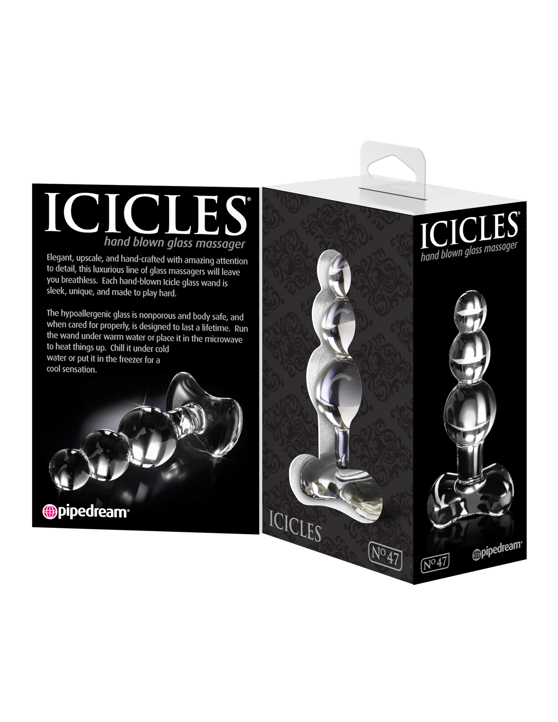 Pipedream Products Icicle line Icicles number 47 glass butt plug. Elegant, upscale, and hand crafted with amazing attention to detail, this luxurious line of glass massagers will leave you breathless. Each hand blown Icicle glass wand is sleek, unique, and made to play hard. This elegant glass massager is perfect for beginners with a tapered tip to ease insertion and a bulbous handle for safe and easy handling. The bumpy texture more effectively grips your Moist lubricant while offering endless stimulation. Enjoy this wand in more ways than one as it can also be used for an erotic external massage. The hypoallergenic glass is nonporous and body safe, and when cared for properly, is designed to last a life time. Run the wand under warm water or place it in the microwave to heat things up. Chill it under cold water or put it in the freezer for a cool sensation. Since glass is nonporous, clean up is a snap. Use Pipedream Toy Cleaner and warm water, or put it in the dishwasher for a worry free wash after the fun. Insertable length 3.75 inches. Width 1.25 inches. Specifications: Length 4.25 inches, Width 1 inch, Height 1 inches, Girth 4.5 inches. Diameter 1.5 inches. Bulk Weight 5 ounces. Shipping information: Package Depth 2.5 inches, Width 4 inches, Height 6 inches. Packaged Weight 7.5 ounces. Package Type Box. Material Glass. Country of Origin China. Pipedream Product Catalog featured in Icicles Catalog. Categories: Anal Toys, Prostate Massagers, P-Spot Stimulators, Small and Medium Butt Plugs, G-Spot. 2022.