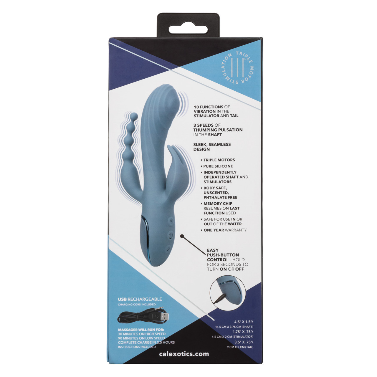 III Triple Ecstasy Rabbit Vibrator from California Exotic Novelties. Indulge your wildest fantasies with the wickedly powerful III Triple Ecstasy. Experience pleasure like never before with the powerful triple action rechargeable Massager with a pulsating Shaft, Beaded tail, and contoured Clitoral stimulator. This daring triple penetrator is made for fulfilling pleasure. The powerful triple penetrating massager uses 3 speeds of pulsation in the sensually curved shaft for G-Spot teasing and shuddering penetration. While a beaded anal tail thrills and a sensual Rabbit teaser flickers to the rhythm of 10 powerful independent functions of vibration. The rhythmic Vibrator teaser and tail deliver show stopping stimulation while the contoured shaft indulges with deep rumbling pulsations. Control and customize your pleasure play with the independently controlled functions. Recharge the Massager in 2.5 hours with the provided USB charging cable to enjoy 30 minutes of high speed action or 90 minutes of low speed stimulation. Enjoy frustration free control with the easy touch 3 button control pad and security lock feature for travel ready pleasure. The virtually seamless body and self sealing charging port allow you to take this versatile waterproof vibrator for a dip. The premium Silicone is body safe, unscented and phthalate free to keep you most sensitive spots happy and healthy. Specifications: SKU SE438610. Color Blue. Power source USB. 1 Year Warranty. Material type Silicone. Features: Phthalate free, Waterproof vibrations, Rechargeable, Vibrates. Measurements: 4.5 inches by 1.5 inches Shaft center vibrator. 1.75 inches by 0.75 inch Clitoral stimulator. 3.5 inches by 0.75 inch Anal tail. Bulk weight 7.3 ounces. Package 8.8 ounces. Package 2 inches by 4.5 inches by 10.4 inches. Categories: Vibrators, Rabbit Style Vibrators, Rechargeable Vibrators, Sex Toys for Women, G-Spot Clit Stimulators, G-Spot Rabbit Style. 2023.