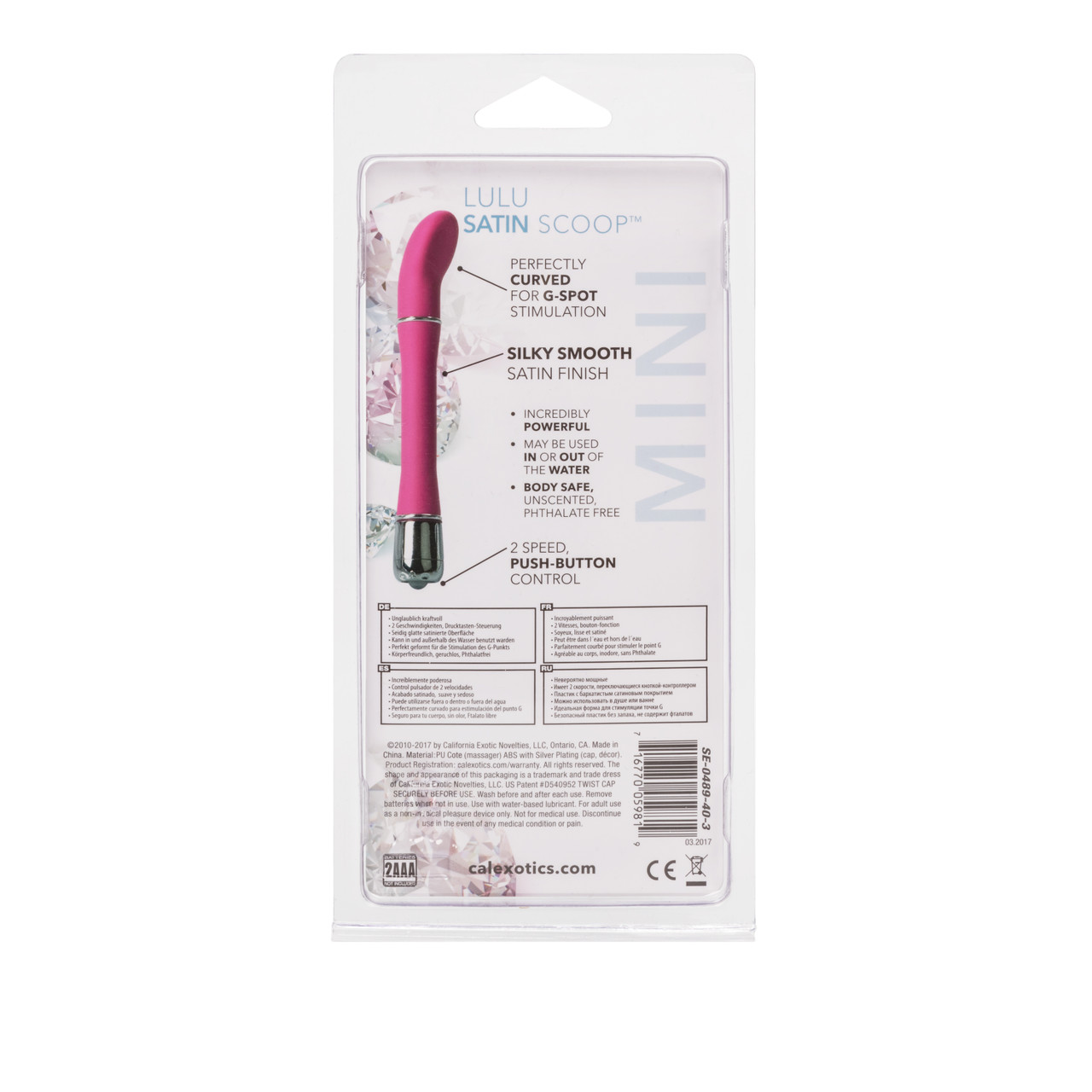 Lulu Satin Scoop Pink Vibrator Hard Vibes from California Exotic Novelties. Silky smooth and virtually seamless, this item is coated in a luxurious Satin finish. Designed for easy use, you will find operation a snap even on the darkest night. Frustration free and perfect for pleasure, just one push brings intense stimulation your way. The perfect discretion no matter where you travel, this beautiful compact product is ready to go whenever and wherever you are. Enjoy the ultimate in pleasure. Intensely powerful sex toy. Satiny soft, slender, and discreetly sized personal massagers with pinpoint tips. Easy to operate push button controls. Waterproof for play outside the bedroom. 2 speeds of vibrations. Classic vibrator measures 5 inches long by .75 inch wide. Safe and pure for body and pleasure. Made using phthalate free, non-toxic materials: Massager ABS Plastic with Polyurethane PU Cote, accents silver plating. Vibrating sex toy requires 2 AAA batteries, not included. Do not leave batteries in the vibrator between uses. A water based lubricant is recommended. Always clean before and after use. 1 year warranty. Categories: Vibrators, G-Spot, G-Spot Firm, Hard Vibrators, Sex Toys for Couples, Men, Women. 2023.