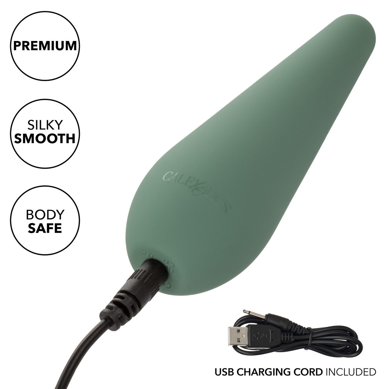 Mod Chic Massager from California Exotic Novelties. Embark on an exquisite journey of discovery with Mod Chíc, a massager that’s designed for precision and pleasure. Its soft, pinpoint tip is perfect for tantalizing play, inviting you to explore the landscape of your desires with a touch that is as gentle or as powerful as your passions demand. With 10 speeds of intense vibration, this device is a versatile powerhouse of pleasure. Each speed offers a unique experience, from a delicate whisper to a deep rumble, allowing you to tailor your journey to the perfect rhythm. The control is in your hands, making every session a personalized dance of vibration and sensation. This massager is crafted from Liquid Silicone, a material celebrated for its superior softness, smoothness, and durability. Not only is it pleasant to the touch, but it’s also waterproof with an IPX7 rating, opening up possibilities for exploration in the bath, shower, or any place where water plays a part in your pleasure. The quality of this device ensures it is a lasting companion on your quest for satisfaction. Thoughtfully designed with your convenience in mind, this massager features a state of the art memory chip that remembers your last speed setting. The security travel lock, activated with a three-second hold, provides peace of mind as you take your pleasure on the road. USB rechargeable and complete with a charging cord, it is ready after just 2 hours of charging, offering 60 minutes of high speed intensity or a luxurious 100 minutes on a lower speed. Mod Chíc is a gateway to new experiences, ensuring every moment is as limitless as your imagination. Specifications: SKU: SE-0009-60-3. Color: Green. 1 Year Warranty. Features: Phthalate Free, Rechargeable, Vibrates. Waterproof rating PX7. Power Source: USB Rechargeable included. Material type: Silicone. Measurements: 4.75 inches by 1.5 inches. Bulk weight 3 ouncces. Package 8.3 ounces. Package: 2 inches by 4.5 inches by 6.25 inches .Maximum Run Time: 100 minutes. Maximum Charging Time: 120 minutes. Speeds: 10. Categories: Vibrators, Clitoral, Eco-Friendly Sex Toys, Rechargeable Vibrators, Sex Toys for Women, Clit Cuddlers. 2024.