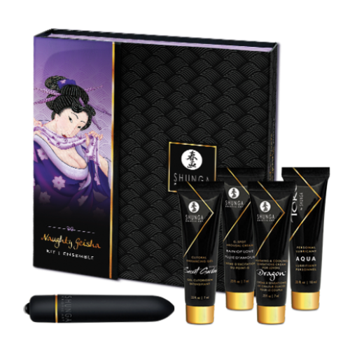 Naughty Geisha Collection Kit from Shunga Erotic Art includes: Toko Aqua Personal Lubricant .33 fluid ounce, Secret Garden Clitoral Enhancing Gel .23 fluid ounce, Dragon Intensifying Cream For Lovers .23 fluid ounce, Rain Of Love G-Spot Arousal Cream .23
