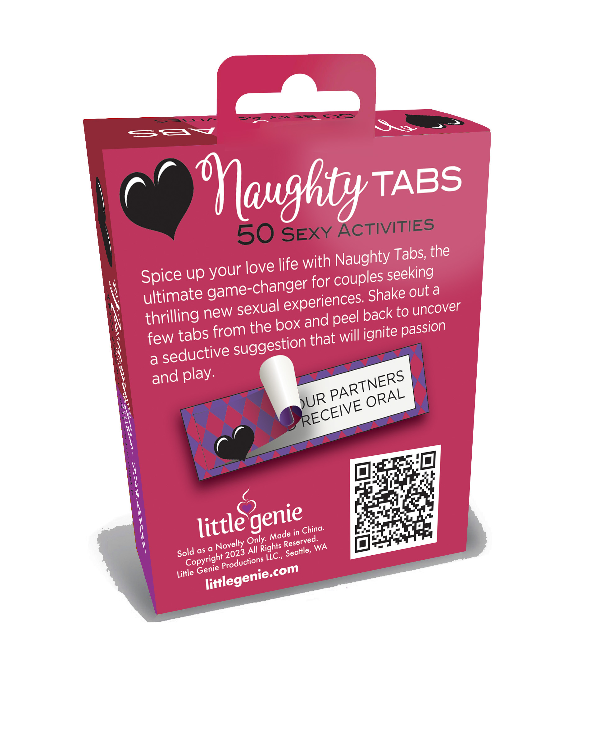 Romantic Naughty Tabs 50 Activities from Little Genie. Exciting sex play activitites. Spice up your love life with Naughty Tabs, the ultimate game changer for couples seeking thrilling new sexual experiences. Shake out a few tabs from the box and peel bac