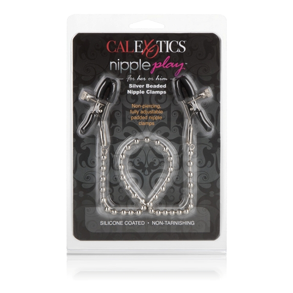 Nipple Clamps Silver Beaded is body jewelry from California Exotic Novelties. The Nipple Play Silver Beaded Nipple Clamps are the perfect exotic adornment for sensitive nipple stimulation and satisfying extended nipple play. The easy squeeze, fully adjustable clamps are ideal for first time and experienced users who want to explore pleasure/pain eroticism. Use the mini clamps for direct nipple arousal and pleasure or on other super sensitive areas of the body. The easy to use clamps are made from non-tarnishing, Nickel free iron and have soft, comfortable phthalate free PVC pads for a pleasurable fit. The fully adjustable mini clamps measure 2 inches and are attached via a sturdy high quality silver beaded chain. To adjust the grip of the two Nipple Clamps, simply twist the screws to intensify the orgasmic tingling sensations. The exciting Silicone coated clamps make a great addition to an intimate toy collection. Explore your fetish fantasies. The feminine beaded design suits submissive lovers who enjoy teasing nipple play. To increase the ultra sensitive sensations, use a hardening arousal gel. Apply the gel directly to the nipple before attaching the squeezable clamps. The tantalizing ripples of pleasure guarantee an orgasmic time. Before and after every use, clean the nipple clamps with a toy cleaner spray. Totally adjustable rubber coated Nipple Clamps with a non-tarnishing chain. Adjustable Alligator Ends Nipple Clamps are easy to change pinch, just turn the tension screw located at the top of each clamp. Safe and pure for body and pleasure. Made using phthalate free, non-toxic materials Steel chain, ABS Plastic beads, PVC tips. Chain between the nipple clamps measures 16 inches long. Each clamp measures 2 inches long. Bulk weight 2.4 ounces. Specifications: SKU SE-2610-10-2. Color: Silver. 1 Year Warranty. Features: Wearable, Phthalate free. Material type: Nickel free Iron Clamps, Chain, Phthalate free PVC Pads. Measurements: 2 inches each clamp. 16 inches chain. Bulk weight 1.4 ounces. Package 2.7 ounces. Package: 0.75 inch by 5.5 inches by 8.25 inches. For Women, Attire and Adornments, Jewelry. Categories: Bondage, Fetish, Kink, Nipple Play, Sex Toys for Women, Body Jewelry, Bondage Kits, Kinky Sets. Nipple Clamps Silver Beaded is a registered trademark for California Exotic Novelties. Sex toys and sexual wellness. 2023.