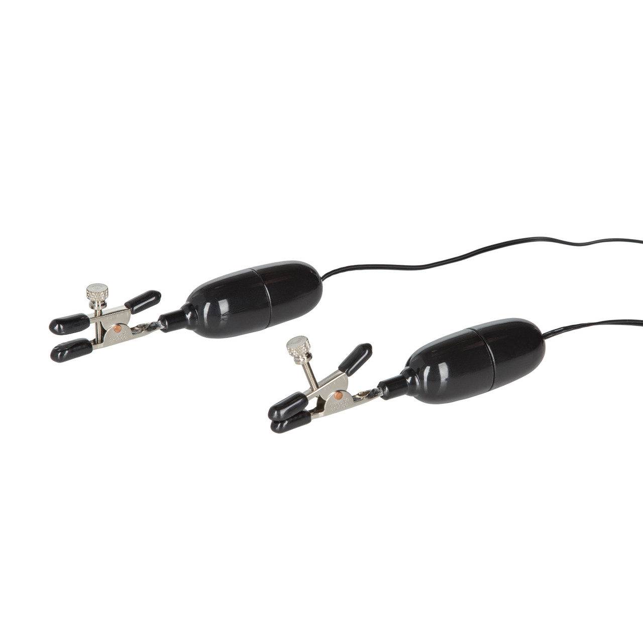 Nipple Play Vibrating Nipple Clamps from California Exotic Novelties for her, him or both of them. Alligator ends are dual rubber dipped for comfort. Non-tarnishing vibrating nipple clamps can easily adjusted with tension enhancer screws. Very powerful multiple speed vibrations. Safe and pure for body and pleasure. Made using phthalate free, non-toxic materials steel with latex tips, ABS Plastic stimulators. Vibrating nipple clamps require 3 AA batteries, not included. Do not leave batteries in the vibrator between uses. Bullet with clamp measures 4.5 inches long. Clamp measures 1.75 inches long. Nipple clamps can be applied to the nipples of either men or women. They create pain/pleasure by restricting blood flow from erect nipples by applying pressure to them. Most nipple clamps are adjustable allowing the user to determine the amount of pressure. Pursuant to 18 U.S.C. 2257, Vibrating Nipple Clamps was produced on August 9, 1995, and the records required to be kept by that law are available at 14235 Ramona Avenue, Chino, California 91710. Custodian of Records: Susan Colvin. or Women, Attire, Adornments, Adornments. Categories: Vibrators, Sex Toys for Couples, Nipple Play, Bondage Kits, Kinky Sets. Vibrating Nipple Clamps is a registered trademark for California Exotic Novelties. Sex toys and sexual wellness. 2023.