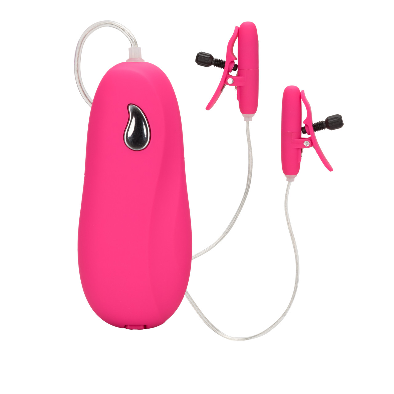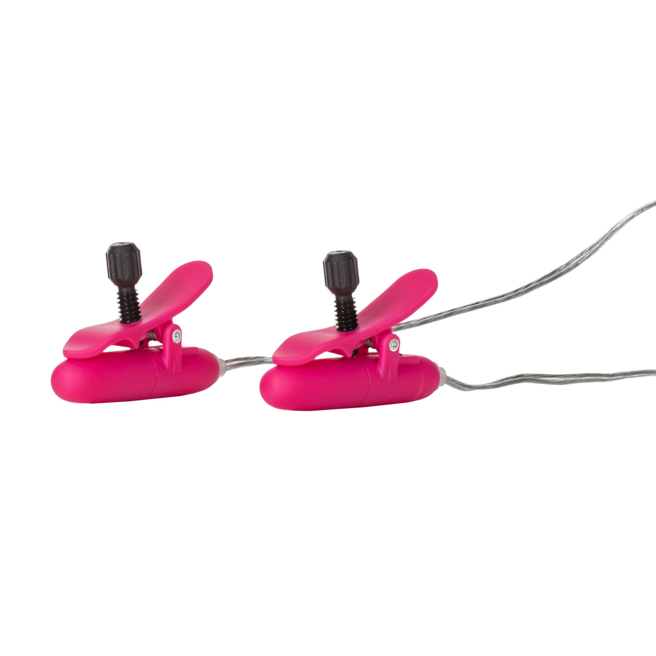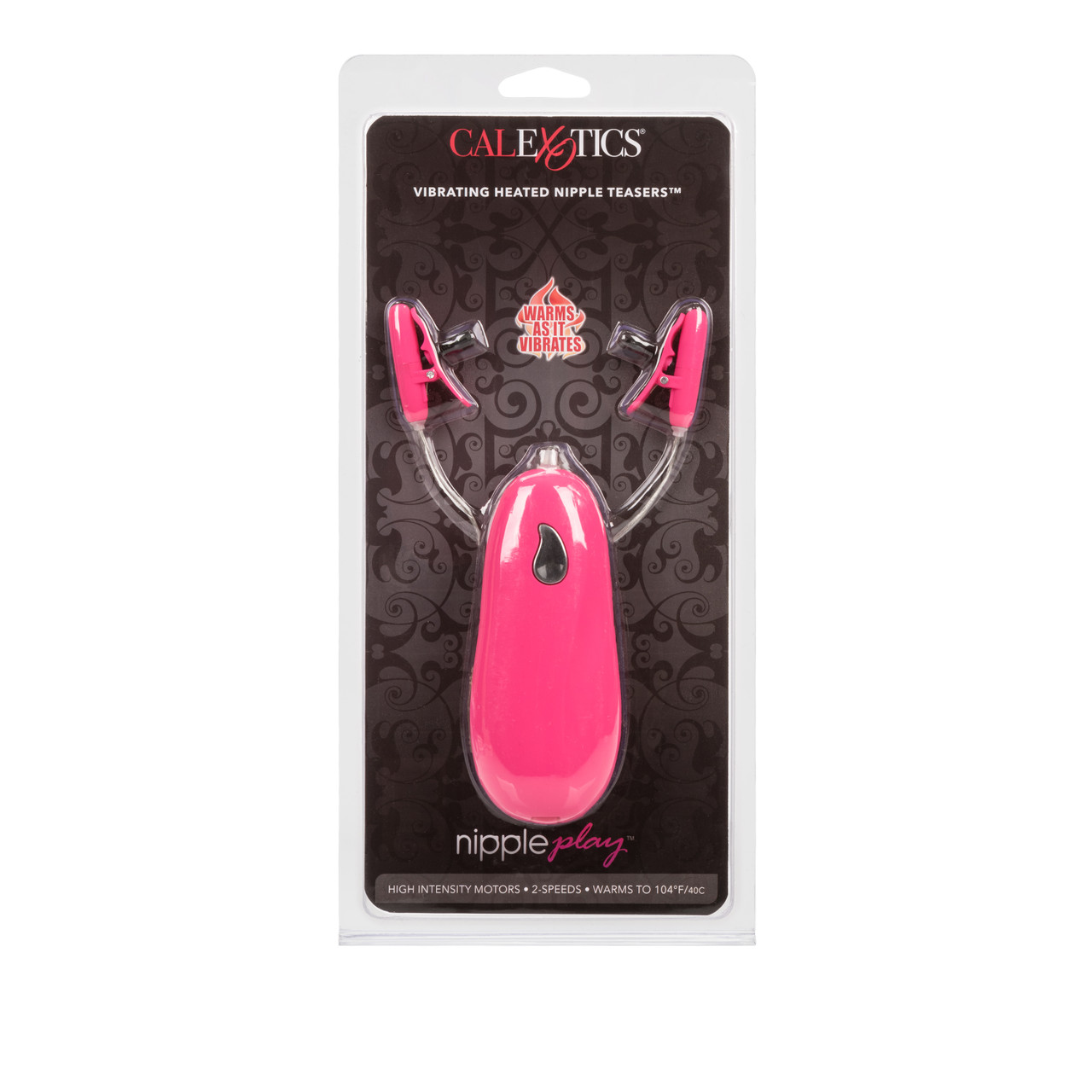 Nipple Play Vibrating Heated Nipple Teasers Pink from California Exotic Novelties. Experience intensely erotic tingles with the Nipple Play Vibrating Heated Nipple Teasers. The easy to use teasers are designed for super sensitive extended nipple play, and are ideal for first time and experienced users. Power up the fun with 2 AA batteries, and turn on the stimulating and tantalizing heated vibrating enjoyment. The petite and discreet non-piercing clamps measure 1.5 inches by 1 inch and are made from ABS Plastic with a Polyurethane PU Cote. The easy twist nylon screws offer speedy adjustment for the perfect fit. When activated, via the ABS Plastic controller, the nipple teasers warm up as they vibrate. Lovers of nipple play fun will be in pleasure heaven. The controller’s high intensity motor and 2 speed action ensures incredibly pleasurable nipple satisfaction. To use, simply attach the clamps directly onto the nipples to experience ultimate warming and vibrating ecstasy. The teasers can also be used on other sensitive areas of the body. Non-piercing, petite, adjustable nipple clamps that warm as they vibrate. Fully adjustable multi-use clamps. High intensity motor with 2 speed push button control. Warms to an incredible 104 degrees Fahrenheit or 40 degrees Celsius. Silky smooth Satin Finish. Safe and pure for body and pleasure made using phthalate free materials ABS plastic with polyurethane PU Cote controller, clamps, Nylon screws, ABS Plastic with silver plating button, PVC cord. Vibrating nipple clamps require 2 AA batteries, not included. Bulk weight 1.8 ounces. 1.5 inches by 1 inch. Categories: Bondage, Fetish, Kink, Vibrators, Nipple Play, Bondage Kits, Kinky Sets, Heats. 2023.