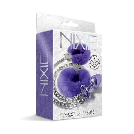 Nixie Metal Plug and Furry Cuff Set Purple Detachable and locking handcuffs feature a Jewel inlaid Metallic from Global Novelties. Great for role play and anal play. Smooth metal tapered shape. Made using Nickel free Aluminum Alloy. Comfortable plug stays