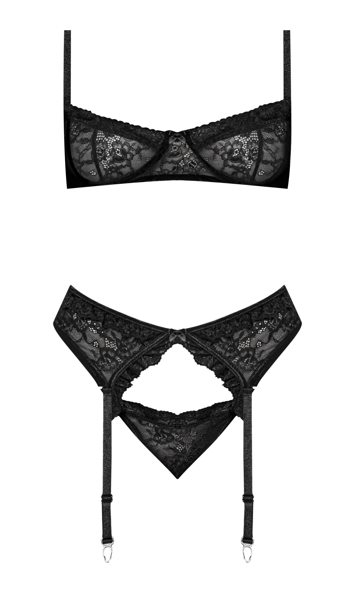 OOH LA LACE DEMI BRA GARTER & TANGA BLACK L/XL