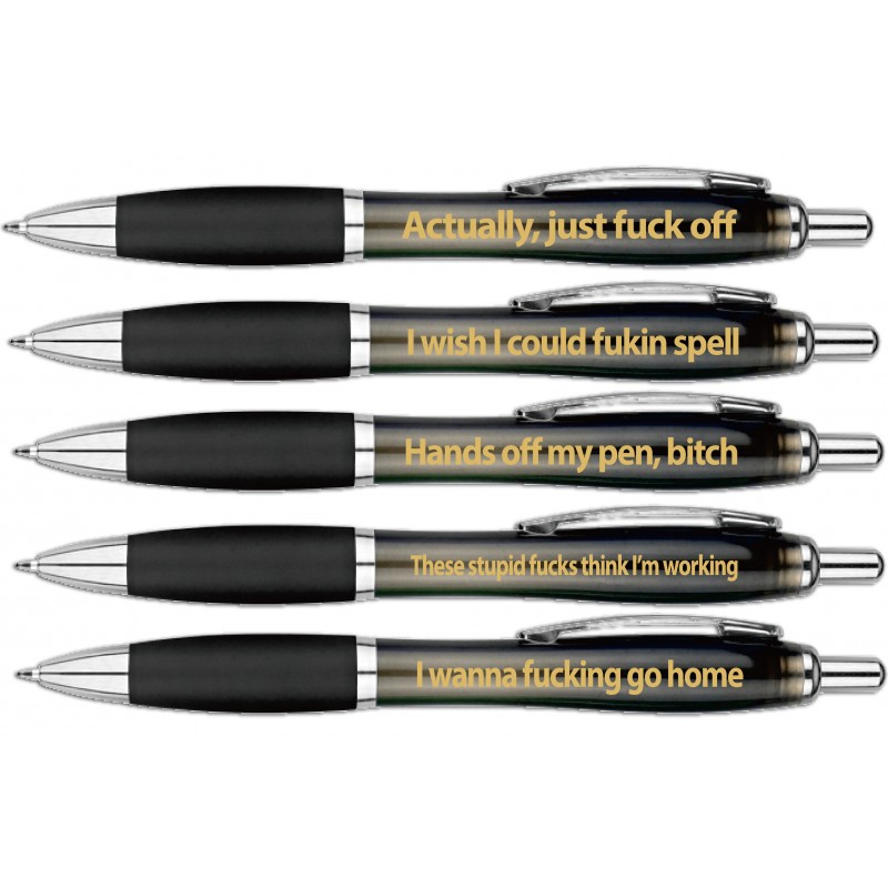 Outrageous Office Pens Despicable Pens For Writing Work Shit Down. Assorted Adult Sayings 5 Pack from Hott Products Unlimited. Want a pen that is really note worthy? Well now you can have fun and create hysterical laughter when you let a friend or coworker borrow your pen with these hysterical assorted sayings pens.Let people really know what is on your mind! Sayings include: Actually, just fuck off, I wish I could fukin spell, Hands off my pen, bitch, These stupid fucks think I’m working, I wanna fucking go home. Features: 5 Nasty Pens included. Great ice breaker. Fun novelty. Categories: Party Games, Gifts, Supplies, Adult Gags, Gifts and Novelties, Risque Office Supplies. Adults only please. 2023.