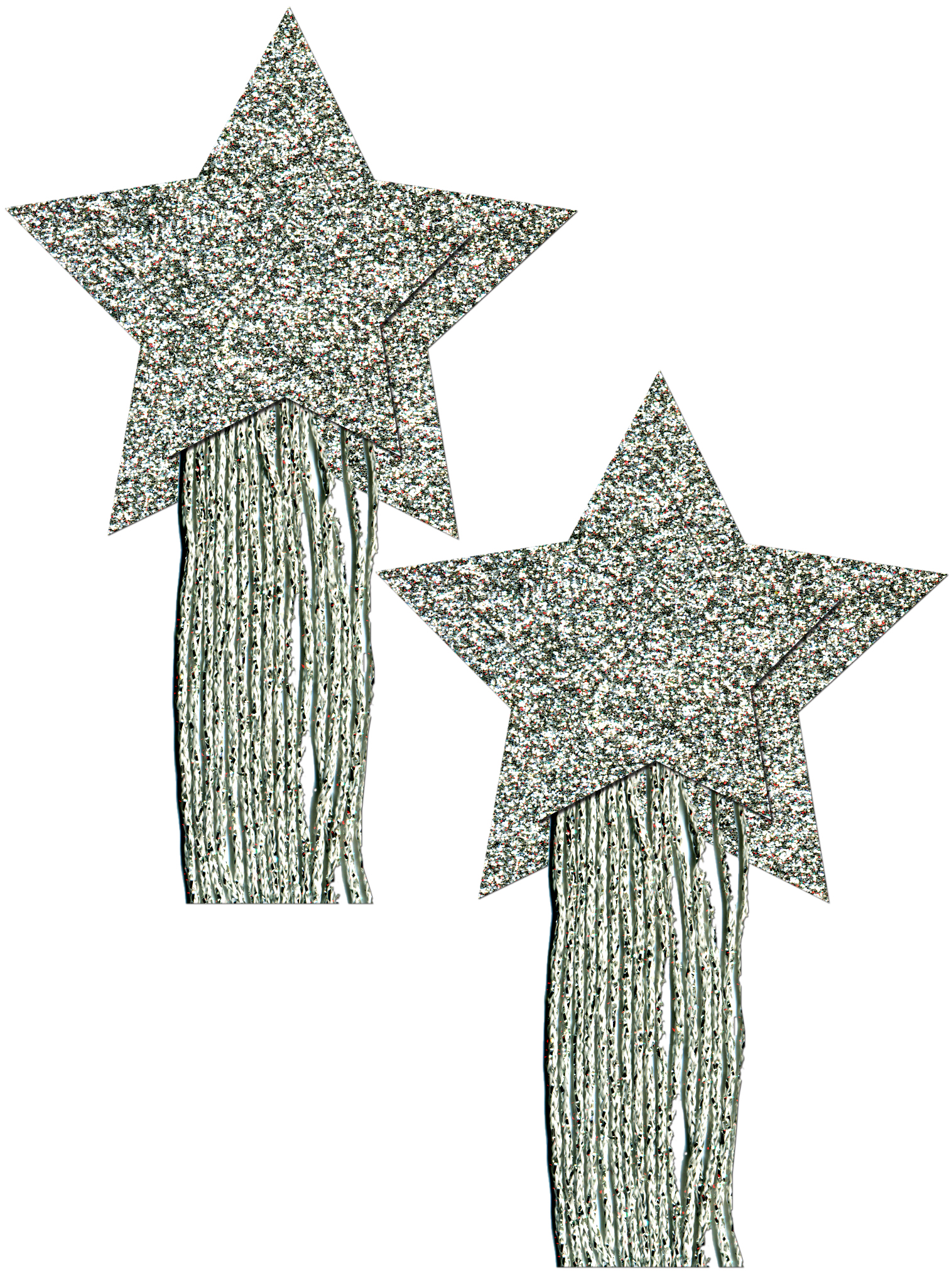 Pastease Star Shaped Tassel Silver Pasties. Pastease Brands. Tassel Pasties: Silver Star Pastease with Long Fringe Nipple Pasties by Pastease. Tassel Pasties: Silvere Star Pastease with Long Fringe Nipple Pasties by Pastease are hand made in the USA of soft form fitting glittery material that forms seamlessly to curves and resists wrinkling over hardening nipples. Easy to apply: just peel and stick these breast tassels on clean, dry skin. All Pastease feature latex free, medical grade, waterproof adhesive that stay securely in place for as long as you like and until they are gently removed. Conceal or reveal with Pastease nipple pasties when worn with a sexy outfit, daring bikini, sheer top, revealing dress, Hefty bag, body lotion, crazy costume, party theme or nothing at all! Size: dimensions 3 inches by 3 inches. Coverage diameter 1.55 inches. Reuse with Pastease Rockstar Refills. Finally! You can rock out with your Glitter Tassel Pastease out! New primary image package. Categories: Lingerie, Clothing, Sexy Costume Accessories, Pasties, Accessories. 2023-2024 Catalog.