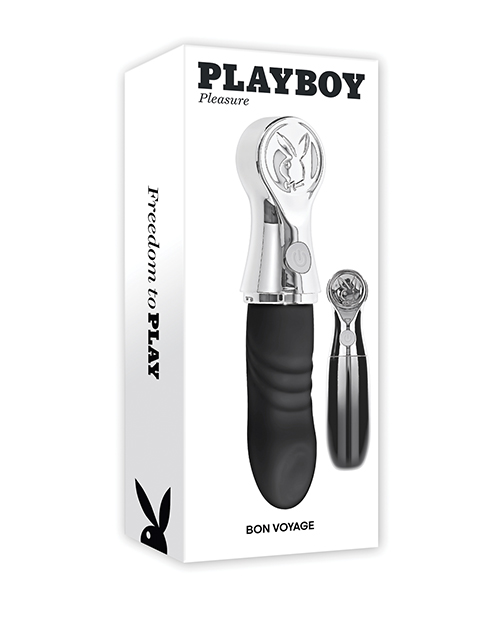 Bon Voyage! We’ve got your travel adventures covered with this powerful tapping toy you can pop into any purse, bag or carry-on luggage for pleasure on the go! The chunky shaft is ribbed for extra sensation and comes to a head with 7 speeds and rhythms of tapping in the beautifully angled tip. With its ombre chrome carrier that twists into place right underneath the ergonomic Playboy rabbit head, your toy is fully protected until you pull it out for play time whenever you like. Heading to the hot tub? Bon Voyage can join your water games as it’s completely submersible!