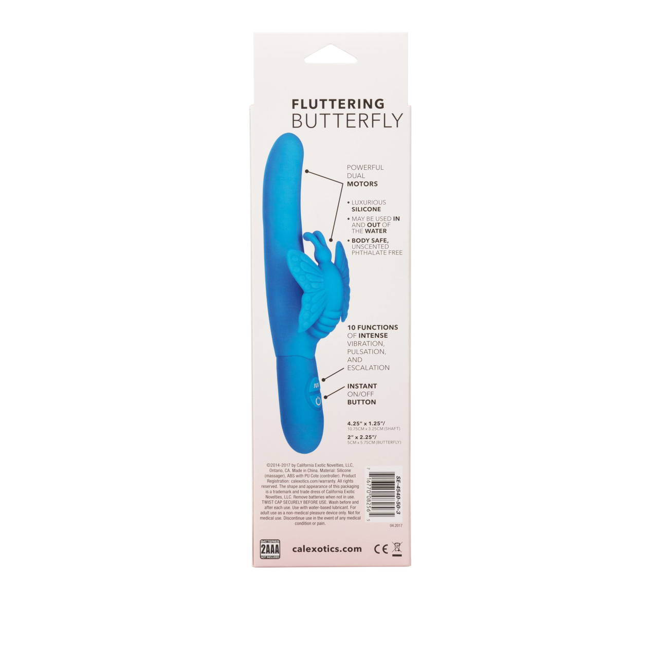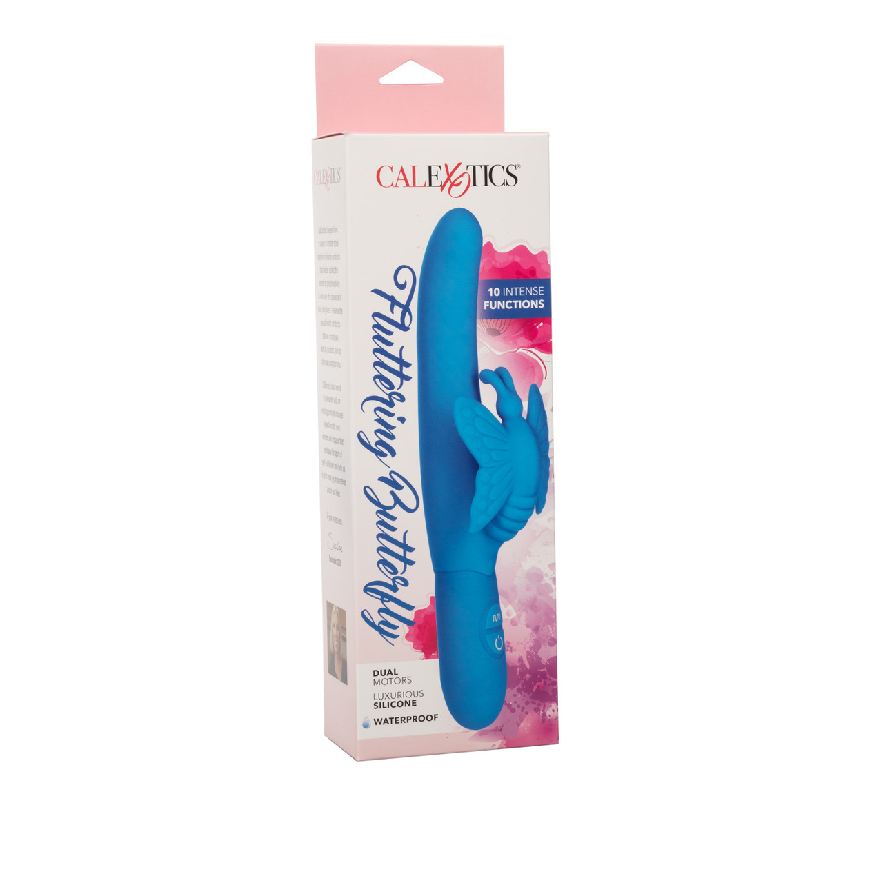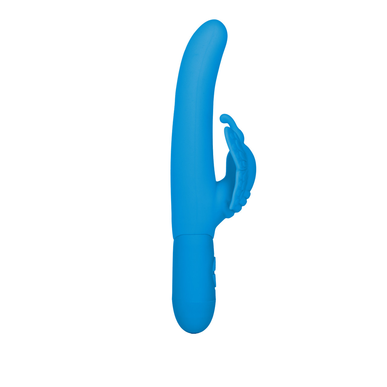 Posh 10 Function Silicone Fluttering Butterfly Blue Vibrator from California Exotic Novelties. Are you ready to drift away on the wings of bliss? The Posh 10 Function Silicone Fluttering Butterfly is ready to transport you to a place of total ecstasy. This super slim Massager is made of the highest quality, body safe Silicone. It is incredibly soft and silky smooth for an unmatched pleasure experience. The soft and pliable shaft will drive you wild as it flexes and moves with you. The synchronized dual motors will send you over the edge with pleasure in no time! Enjoy the incredible vibrating sensations inside you as the butterfly’s antennae tickle your clit and the fluttering wings caress your lips. The massager features 10 intense functions of vibration, pulsation, and escalation for a totally personalized orgasm experience. Takes things slow and teasingly and tickle yourself to a gradual, long awaited explosion of pleasure or release all of your pent up desire and race to release. It also features a quick shut off feature to save you from surprise interruptions and is waterproof for fun in the shower, the tub, or even the pool. It is easy to get started: Just insert 2 AAA batteries, press the bottom button to turn on your massager, and press the top button to explore all 10 functions this sleek and smooth butterfly has to offer. The shaft measures 4.5 inches long and 1.25 inches wide and is the perfect size to unlock every inch of amazing sensation.Super slim, soft and pliable seamless Silicone massager. Dual motors with 10 functions of vibration, pulsation and escalation. Soft touch controls with auto on/off. Waterproof for play beyond the bedroom. Specifications: SKU SE-4540-50-3. Color: Blue. 1 Year Warranty. Features: Phthalate free, Vibrates. Waterproof vibrations. Power source: 2 AAA batteries, not included. Material type: Silicone Massager, Buttons, ABS Plastic with a Polyurethane PU Cote Controller. Measurements: 4.25 inches by 1.25 inches Shaft. 2 inches by 2.25 inches Clitoral Stimulator. Bulk weight 5.2 ounces. Package: 6.6 ounces. Package: 2 inches by 3.25 inches by 11 inches. Functions: 10. Categories: For Women, Vibrator, Vibrators. Categories: Vibrators, Rabbit Style Vibrators, Sex Toys for Women, G-Spot Rabbit Style Vibrator, Flexible Vibrators, G-Spot Vibrator. Posh 10 Function Silicone Bounding Bunny is a registered trademark for California Exotic Novelties. Sex toys and sexual wellness. 2023.