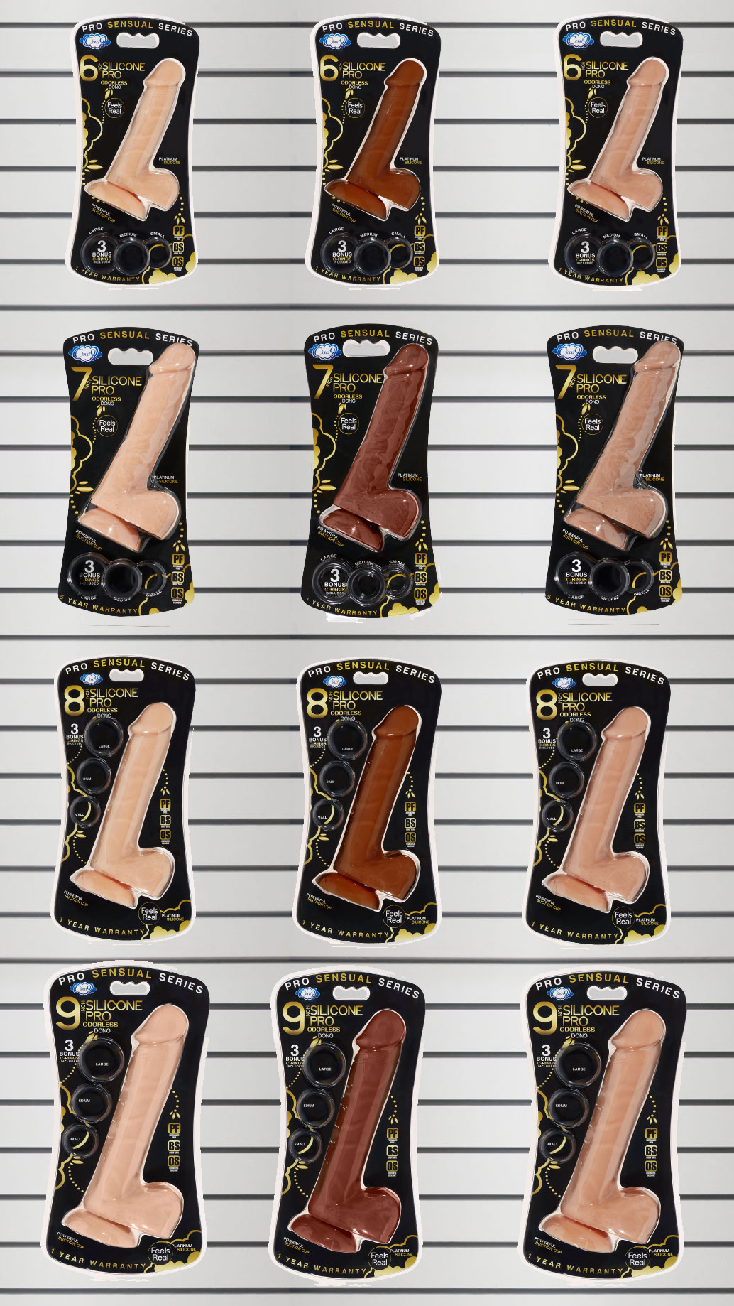 Pro Sensual Premium Silicone Dong Planogram 12 Pieces 1 each color 6 inches, 7 inches, 9 inches Dongs from Cloud Nine Novelties. Realistic Dongs come in three colors shades: Light Skin Tone, Medium Skin Tone and Dark Skin Tone. Sized and shaped perfectly,