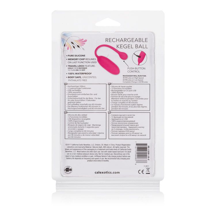 Rechargeable Kegel Ball Advanced Pink from California Exotic Novelties. Primed and ready for your next Kegel workout. the Rechargeable Advanced Kegel Ball is here to intensify your Kegel Exercise Routine. The all women product development team of Cal Exotics has done it again by designing a Kegel Vibrator as comfortable as it is thrilling with 12 intense vibration functions, plush Silicone Body and flexible Retrieval Cord. Recharge the Premium Silicone Massager in 1 hour with the provided USB charging cable to enjoy 40 minutes of high speed stimulation or 60 minutes of low speed vibrations. The dual action retrieval cord also acts as an easy push single button control with a travel lock feature for fun on the go. While the easy button controls the intensity and the Mini Vibrator gives you the stimulation you want, the integrated state of the art memory chip remembers just how you like it by starting on the last function used. The self sealing charging port and virtually seamless body let you get steamy in and out of water with this waterproof weight. The hypoallergenic Premium Silicone is body safe, unscented and phthalate free to keep you most sensitive spots, happy and healthy. Designed for easy use, you will find operation a snap even on the darkest night. Frustration free and perfect for pleasure, just one push brings intense stimulation your way. As simple to clean as it is easy to use, you will find cleaning a snap. This item features a state of the art memory chip that will resume on the last function used. Reignite the pleasure, right where you left off. Simple to use, this product is perfect for beginners too. Get ready to enjoy the peak in sensual pleasure. Bulk weight 1.9 ounces. Materials: Silicone, ABS Plastic. Functions a variable speed control takes you to the height of gratifying pleasure. You will find sensual stimulation that throbs with excitement. 12 functions bring you thrilling elements of vibration, pulsation, and escalation. Experience the ultimate bedroom adventure! Battery information this product includes USB charging capabilities. Measurements: 3 inches by 1.25 inches Ball. Categories: Rechargeable Vibrators, Sex Toys for Couples, Men, Women, Pelvic Exercisers, Health and Beauty Aids, Kegel Balls. 2023.