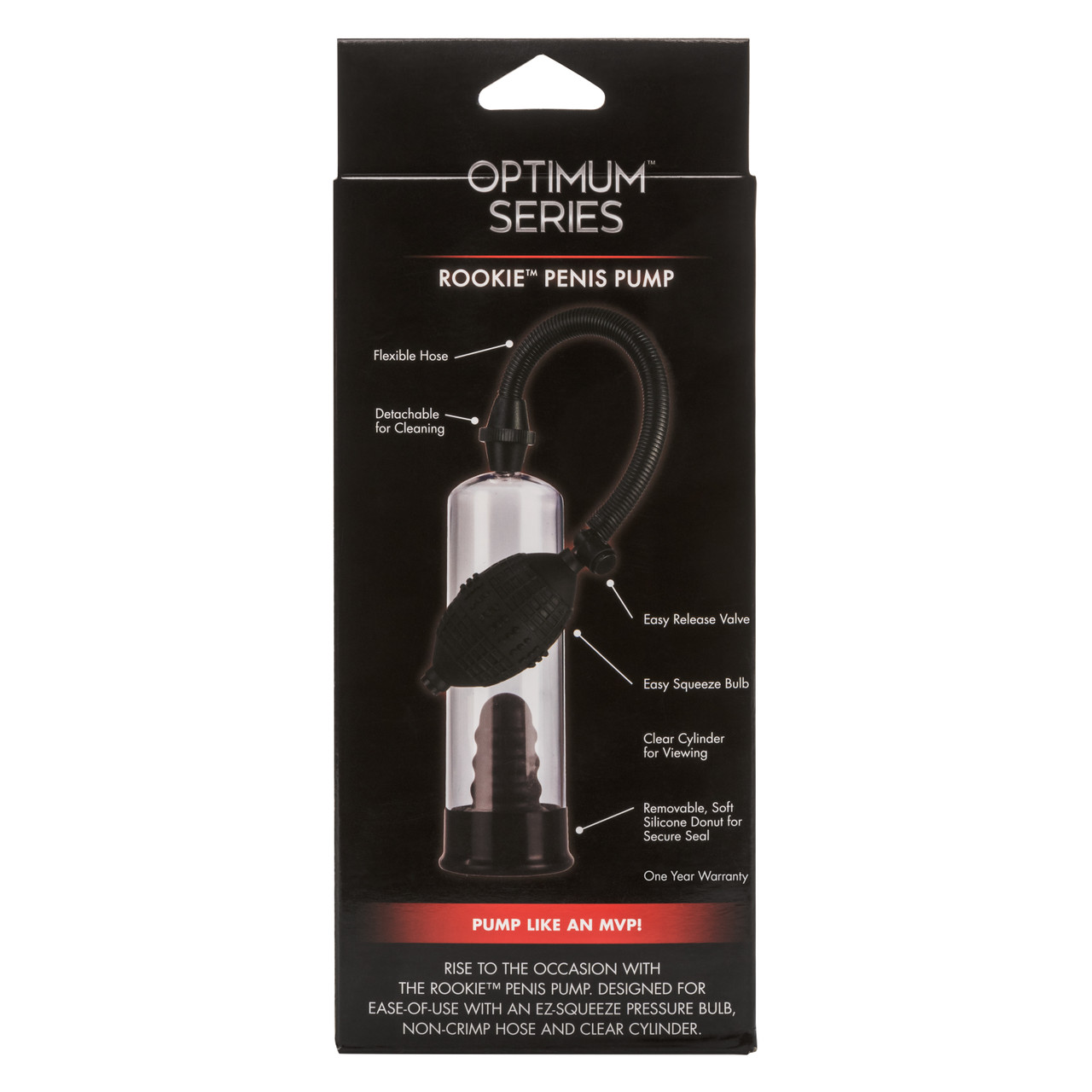 Optimum Series from California Exotic Novelties. Rise to the occasion with the Rookie Penis Pump! Superior suction, wonderful comfort, and an easy to use system will have you Pumping like a MVP in no time. This Pump is a pleasure Enhancer designed to give