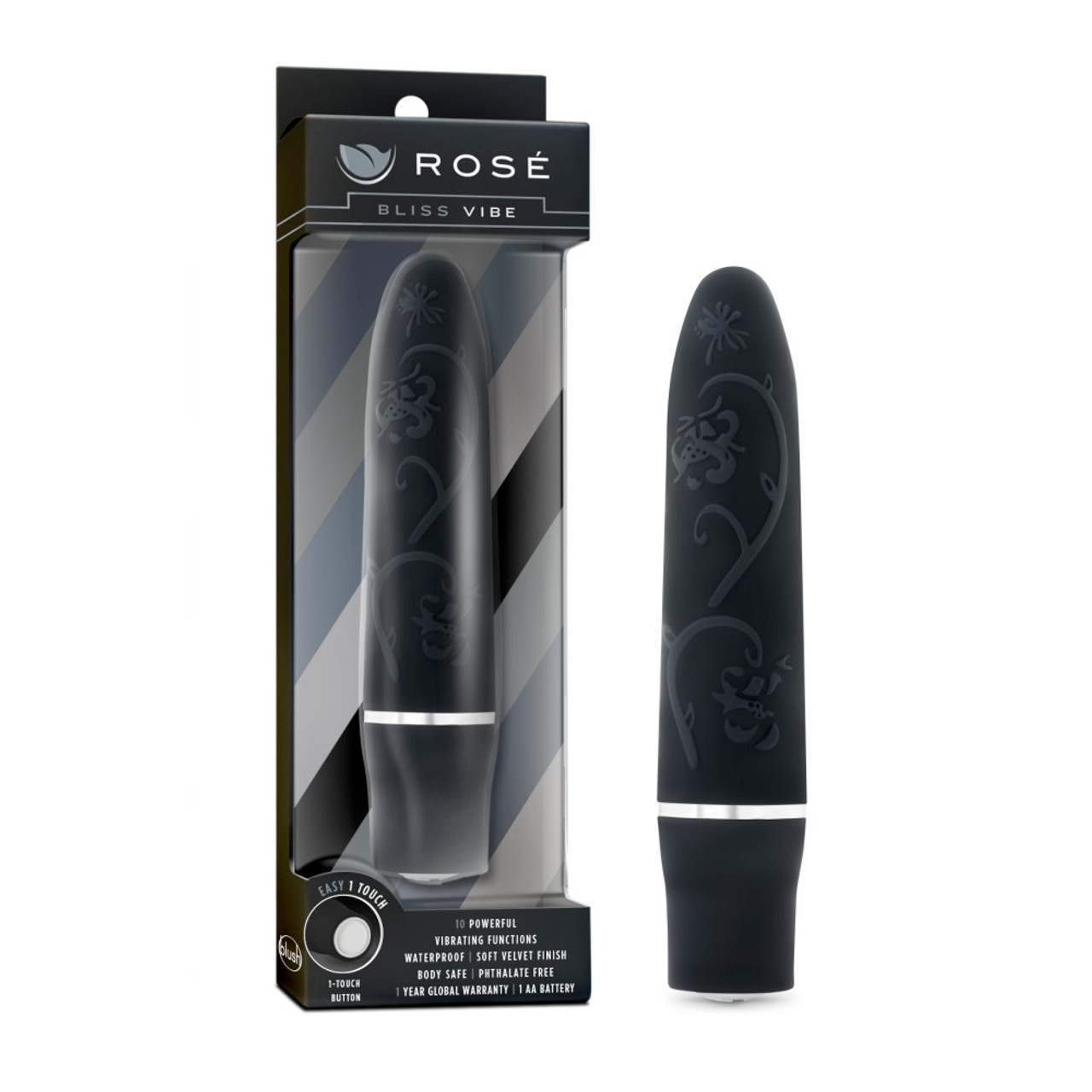 Rose Bliss Black 10 Vibrating Function Waterproof Mini Vibrator. When was the last time you had complete and utter sexual Bliss? Well your ecstasy of salvation is right here, Bliss by Blush Novelties! Measuring just 4 inches, this pocket or purse vibe is the perfect travel pal and is ready to rapture you! Bliss is phthalates free and has a smooth satin finish that becomes slippery when wet! The easy 1 touch push button on the base gives you the choice of two powerful vibrations, super charged and turbo charged. And now it is waterproof, so you can take it into the shower, bath or hot tub; you can make some serious waves with this one! Pick up your new path to erotic Bliss today and let it take you straight to cloud nine! Vibrating sex toy requires 1 AA battery, not included. Waterproof vibration for play outside the bedroom. Waterproof sex toys with this designation are safe for use in the bath or shower. Do not submerge for long periods of time and take care to thoroughly dry after each use. Remove battery after each use. Made using phthalate free, non-toxic materials ABS plastic bullet vibrator. Water based personal lubricant is recommended. Bliss Mini Vibrator features: 4 inches long, smooth satin finish, waterproof, 10 vibratiing functions, convenient push button operation, powerful and quiet. Product specifications: Length 4 inches. Width 0.8 inches. Circumference 2.51 inches. Bulk Weight 0.8 ounce. How to use: power and motion insert 1 AA battery. Push button on bottom. Cleanse and care run water and apply a mild soap or wipe with a choice toy cleaner. Then let air dry. 1 year warranty from Blush Novelties. Blush Novelties – Rose Bliss. Categories: Vibrators, Bullets and Eggs, Sex Toys for Women, Vibrating Bullets and Eggs. Restricted, Amazon Restricted. 2024.