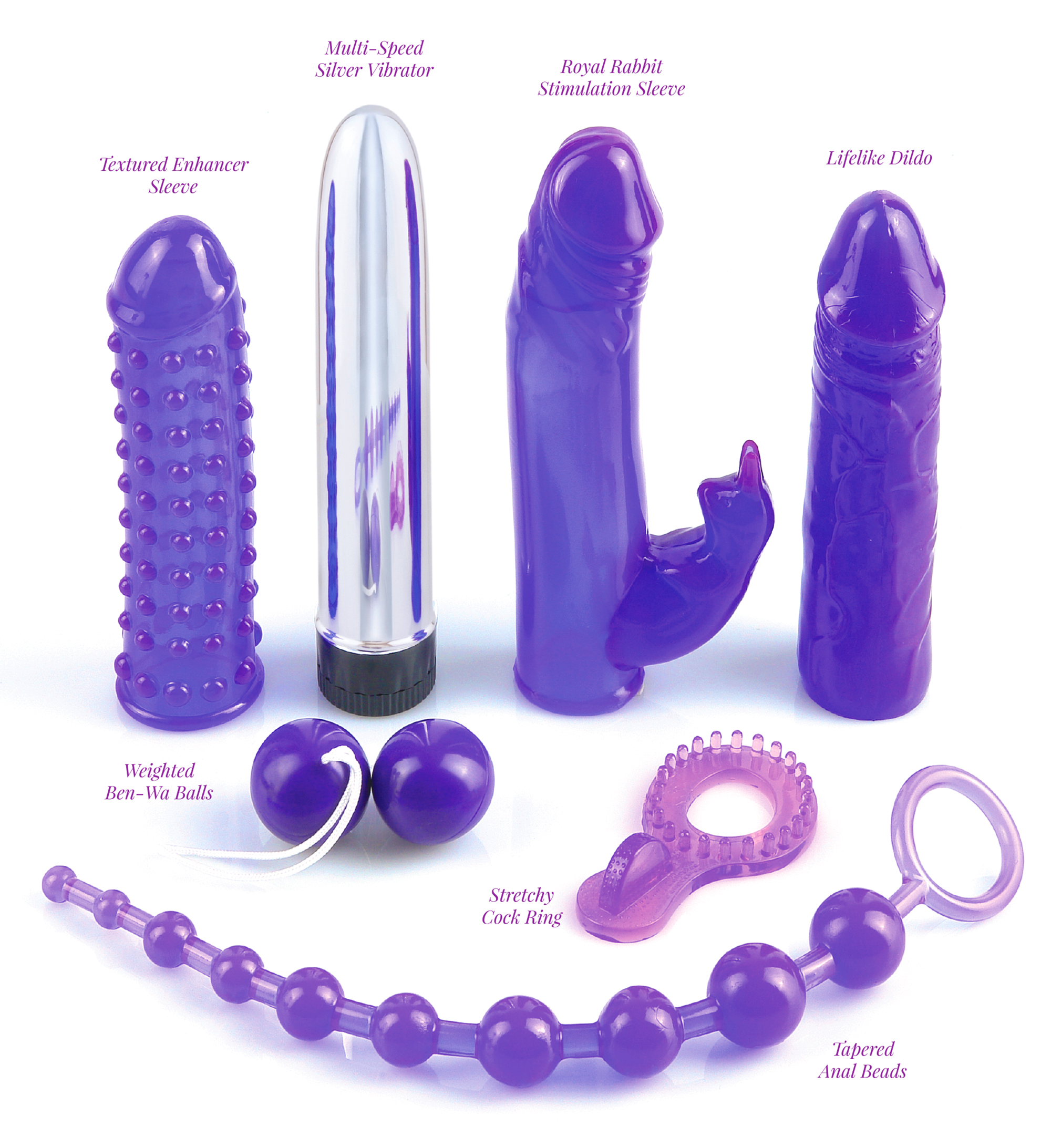 Royal Rabbit Kit let purple reign! Everything you need for sexual experience. The Royal Rabbit Kit includes seven magnificent items of pure gratifying pleasure. The multiple speed, silver vibe and two sleeves will satisfy your deepest yearnings. Try the t