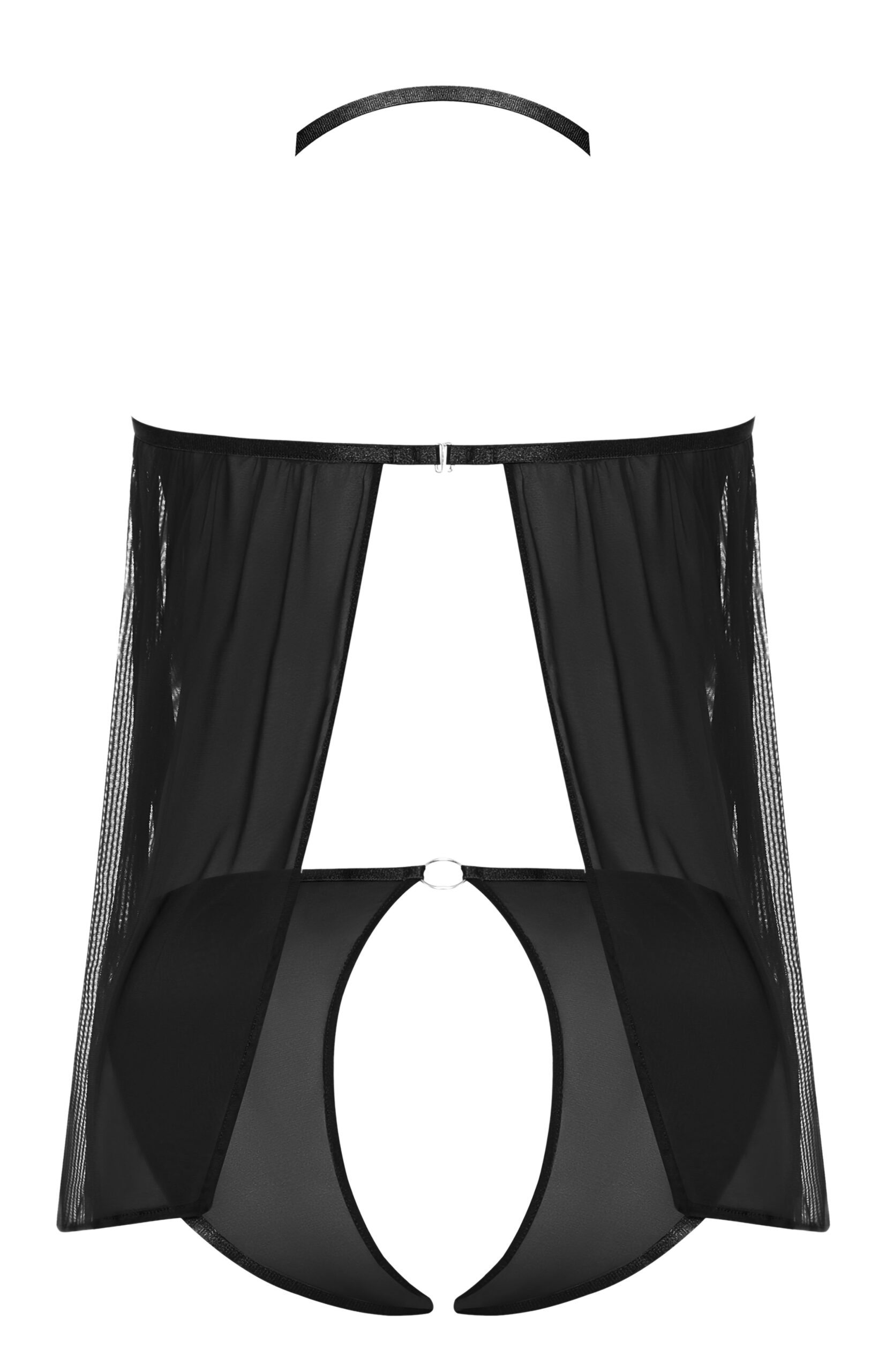 Sassy Cupless Babydoll and Panty Set Black from Magic Silk Lingerie Exposed collection. Item: Magic Silk Cupless Babydoll and Crotchless Panty Set MSM259. Colors: Black, Cobalt. Sizes available: S/M, L/XL, Queen. From the Exposed by Magic Silk collection, this style includes: a cupless babydoll featuring a flowy, non-restrictive hip length design with an open flyaway back, an elastic and adjustable halter strap with gold tone sliders, and swan hook closure at the neck and back, gold tone O-ring details through out, and a matching crotchless and open back panty featuring soft bikini style sides. Collection: Sassy. Fabric feeling: soft, stretch mesh with sleek gold metal details. Fabric content: 92% Polyester, 8% Spandex. Care instructions: hand wash, cold water. No bleach. Dry flat. Ladies sizes large to extra large, L/XL. Ladies sizes large to extra large. Women dress sizes 16 to 18. Categories: Lingerie, Clothing, Naughty Role Play, Babydolls, Slips. Magic Silk Women’s Sexy Lingerie. U.S Lingerie Company, Ladies Intimate Apparel. 2023.