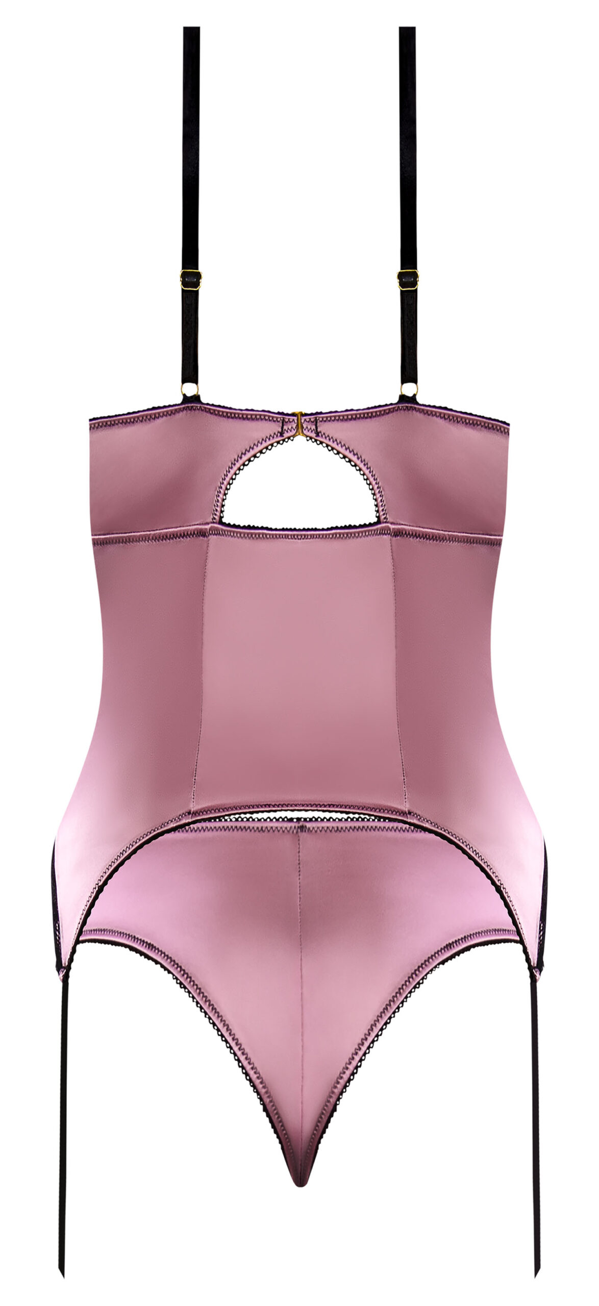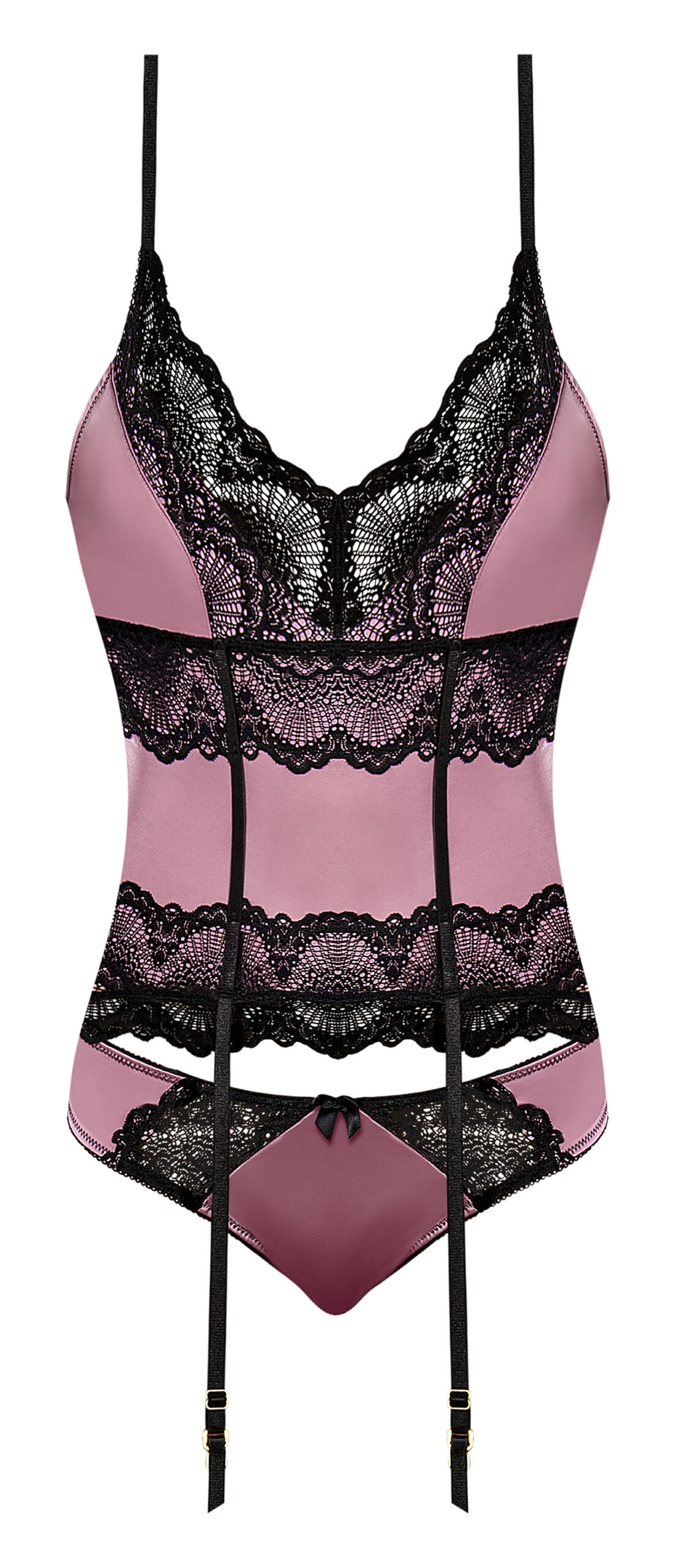 Sensual Desires Basque and Tanga Set Mauve L/XL from Magic Silk Lingerie. From the Exposed by Magic Silk collection, this style includes: a lace and satin basque featuring a plunge style neck line, elastic and adjustable shoulder straps with gold tone sl