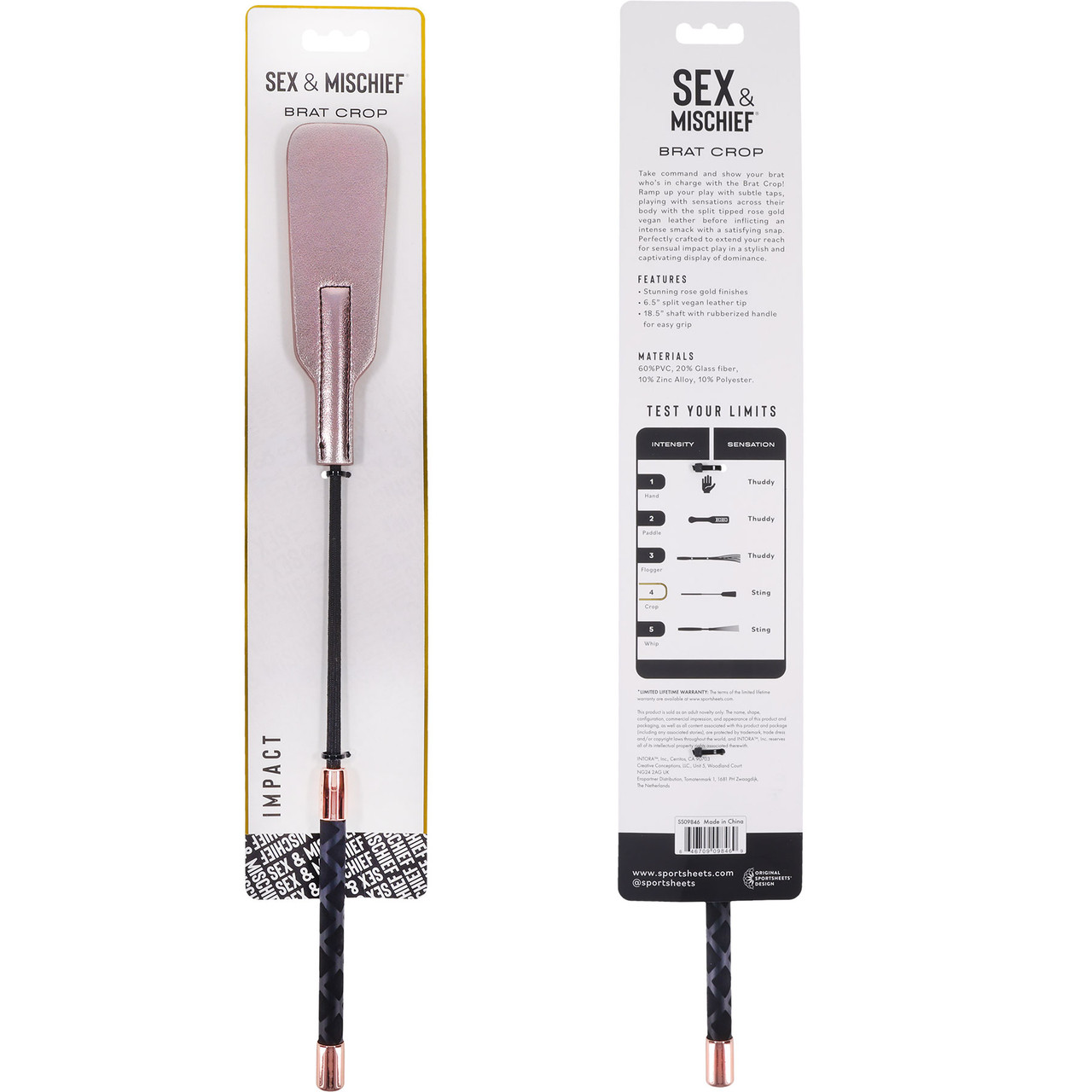 Sex and Mischief Brat Crop from Sportsheets. Take command and show your brat who is in charge with the Brat Crop! Ramp up your play with subtle taps, playing with sensations across their body with the split tipped rose gold vegan leather before inflicting an intense smack with a satisfying snap. Perfectly crafted to extend your reach for sensual impact play in a stylish and captivating display of dominance. Features: Stunning Rose Gold Finishes. 6.5 inches Split Vegan Leather Tip. 18.5 inches Shaft with Rubberized Handle for Easy Grip. Stunning Rose Gold Finishes. 6.5 inches Split Vegan Leather Tip. 18.5 inches Shaft with Rubberized Handle for Easy Grip. Categories: Bondage, Fetish, Kink, Sex Toys for Couples, Whips, Paddles and Ticklers. 2024.