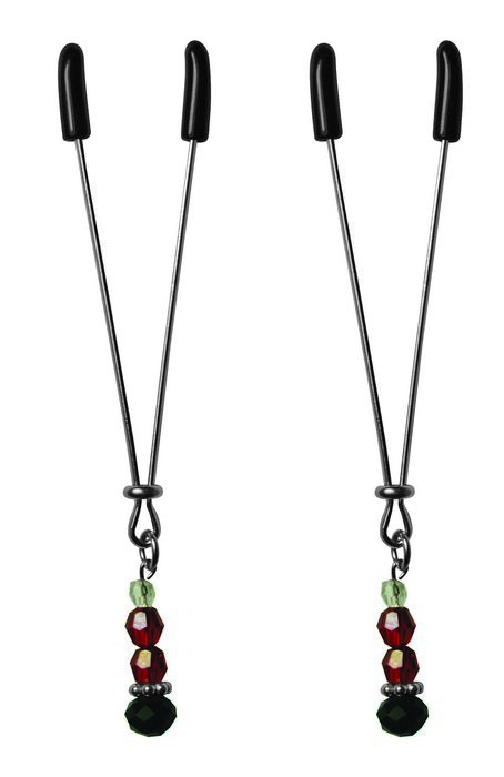 From Sportsheets Sex and Mischief line Nipple Clips Ruby Black tweezer style clamps. New to nipple play? These Nipple Clamps are perfect for the beginner. Easy to adjust pinch. Rings slide down the shaft of the tweezer like clip for as snug as you like s