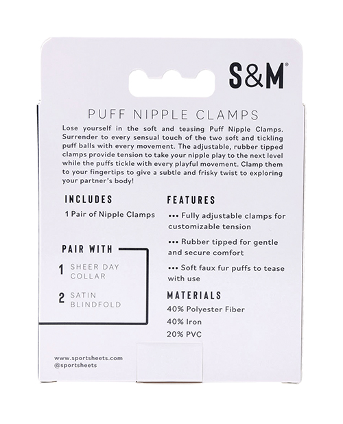Sex and Mischief Nipple Clamps from Sportsheets. Lose yourself in the soft and teasing Puff Nipple Clamps. Surrender to every sensual touch of the two soft and tickling puff balls with every movement. The adjustable, Rubber tipped Clamps provide tension to take your nipple play to the next level while the puffs tickle with every playful movement. Clamp them to your fingertips to give a subtle and frisky twist to exploring your partner’s body! Features: fully adjustable nipple clamps for customizable tension. Rubber tipped for gentle and secure comfort. Soft faux fur puffs to tease with use. Please note no painful body piercing. Alligator ends with a PVC cover to prevent pinches. Adjustable alligator ends covered in PVC. Materials: Nickel free Iron, Polyester, PVC. Color: Black. UPC: 646709098551. MPN: SS09855. Pair with Sheer Day Collar, Satin Blindfold for added sensations. Categories: Bondage, Fetish, Kink, Sex Toys for All, Couples, Males, Females, Nipple Play, Sensual Kits, Pasties and Accessories, Bondage Kits, Kinky Sets. 2023.