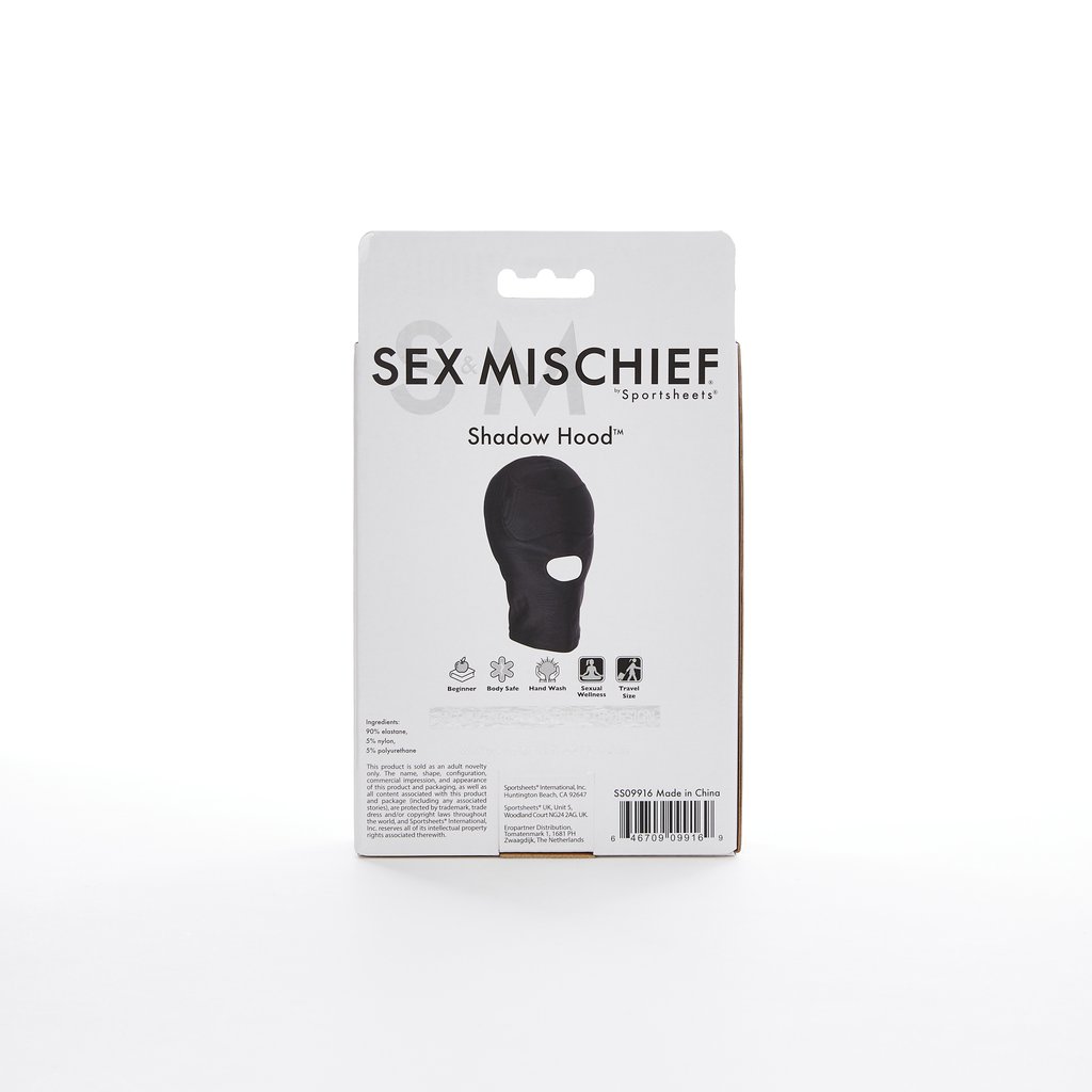 Sex and Mischief Shadow Full Hood from Sportsheets. Tantalize your submissive senses by depriving them.. Make your lover quiver with anticipation by exploring the world of deprivation and control play with your partner wearing the Shadow Hood. Discover th