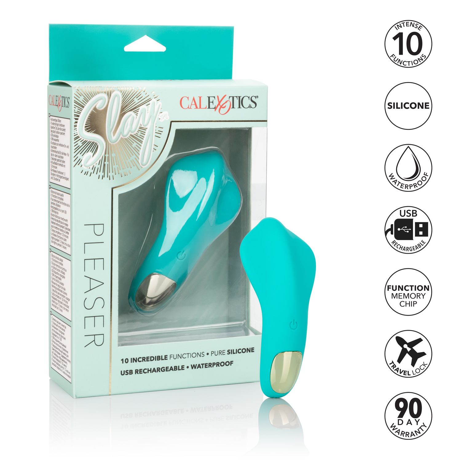 Slay Pleaser Green Vibrator from California Exotic Novelties. Slip the tickling Slay Pleaser into your purse or handbag for knee shaking pleasure wherever you go. The sensually contoured massager fits between your fingers to let you deliver pinpoint tantalization and thrill with flexible vibrations. Get playful while you flicker through 10 indulgent vibration, pulsation and escalation functions with the easy touch control button. The ergonomically curved toy can be used as a vivacious mini vibrator or discreet panty teaser for pleasure to go. Effortlessly control pure pleasure with an easy touch silicone button and hold for 3 seconds to turn on or off. Use the smooth single button control to enjoy up to 1.5 hours of vibrating pleasure. Charge up your passion in only 2 hours by plugging the provided USB cable into the self sealing charging port on the back of the massager. The slim massager discreet 4 inches size makes it the perfect travel companion, letting you embrace radiating pleasure wherever your fantasies take you. Color Teal Green. Materials Silicone, ABS Plastic with Metallic Plating. Power source USB Rechargeable, cable included. Features phthalate free, waterproof, rechargeable, vibrates. Maximum run time 120 minutes. Maximum charging time 120 minutes. Measurements 4.5 inches by 2 inches overall. 2.75 inches by 2 inches vibrator. Bulk weight 1.8 ounces. Package 5 ounces, 2 inches by 4.75 inches by 8.5 inches. Categories: Clitoral Stimulators, Eco-Friendly Sex Toys, Rechargeable Vibrators, Palm Size Massagers, Sex Toys for Women, Flexible Vibrators. 2023.