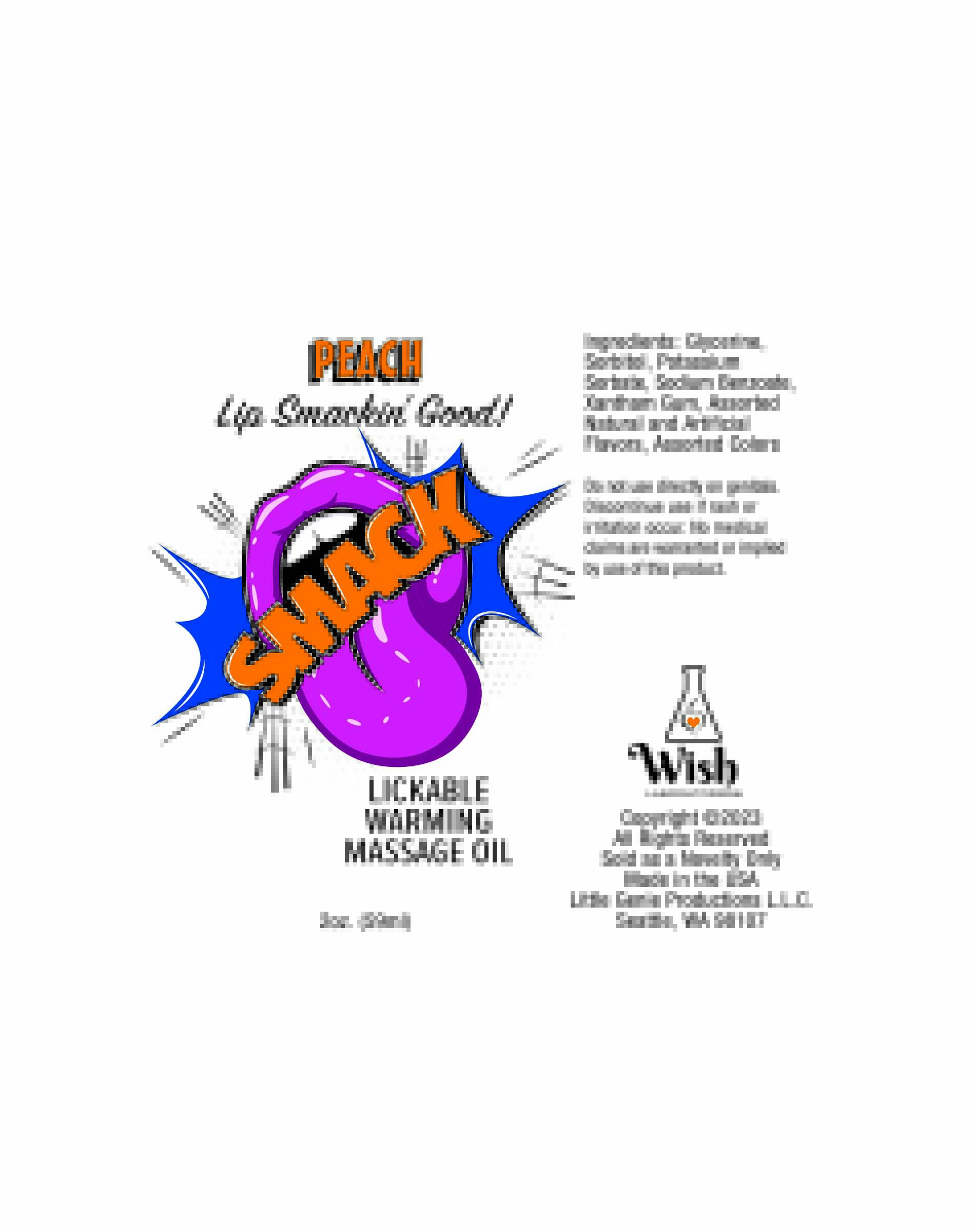 Smack Peach 2 fluid ounces Warming Massage Oil from Little Genie. Take your partner on a tantalizing flavor journey with Smack Warming and Lickable Massage Oil. Engage in a tasty and playful massage experience in six delectable flavors: Blue Raspberry, Ch